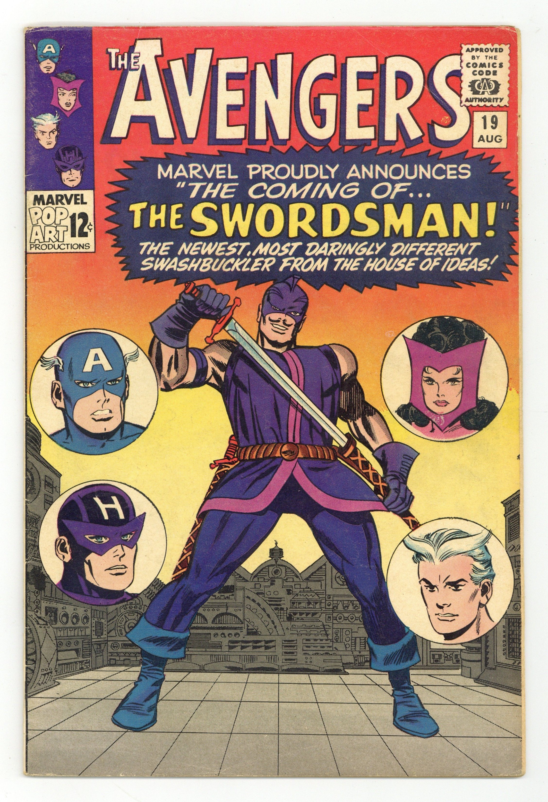 Starts Feb 16 Cover pencils by Jack Kirby and Don Heck (insets), inks by Frank Giacoia. First appearance of the Swordsman and the origin of Hawkeye in "The Coming of... the Swordsman!", script by Stan Lee, pencils by Don Heck, inks by Dick Ayers; The Swordsman infiltrates the Avenger's base and Scarlet Witch and Quicksilver attack him; He then admits he was testing them and wants to apply for membership; Captain America intervenes with information saying he is a wanted man and the Swordsman escapes; Hawkeye explains that the Swordsman used to be his tutor when he was in the circus; Meanwhile, in Nick Fury's office in Washington D.C HYDRA agents find a letter from Captain America; They later discard it as trash; It explained how Captain America wanted to work for S.H.I.E.L.D.; A mobster finds it and gives it to the Swordsman; A trap is laid for Captain America; He then leaves to meet with "Nick Fury"; Hawkeye finds out about the plan and gathers the other Avengers to help him; Captain America battles the Swordsman and gets captured before the others can arrive to help. Avengers Roll Call: Captain America, Hawkeye, Quicksilver, and the Scarlet Witch. Letter to the editor from Cary Burkett. 36 pgs., full color. $0.12. Cover price $0.12. Grade: VG+ 4.5 explanation of grade Condition: Used (collectible)
