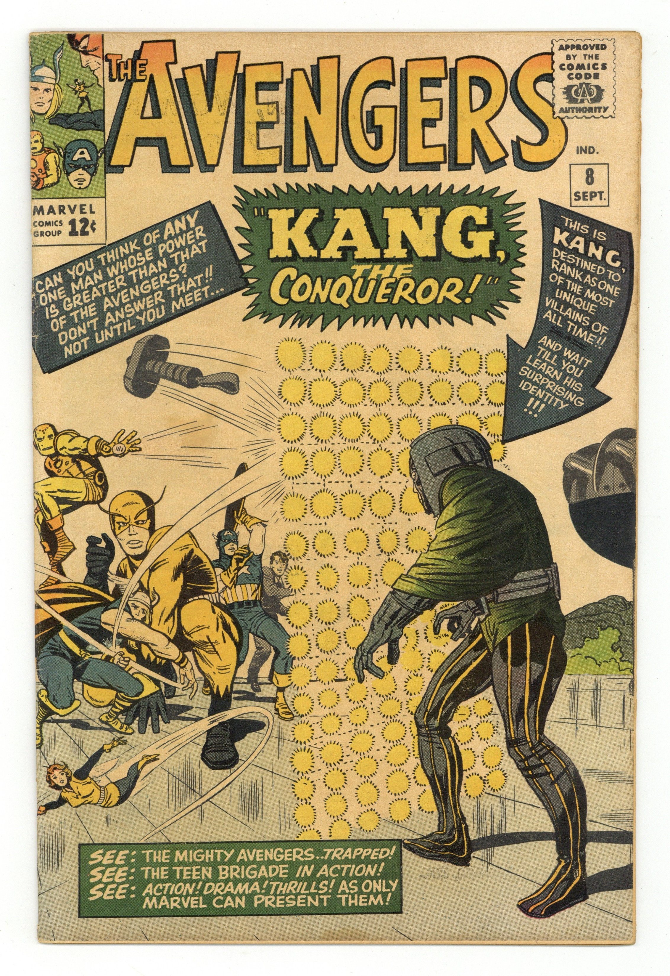 Cover pencils by Jack Kirby, inks by Dick Ayers. Kang, The Conqueror!, script by Stan Lee, pencils by Jack Kirby, inks by Vince Colletta cover; Kang appears and demands to be made ruler of the Earth; The Avengers attempt to stop him, but it comes down to Wasp and the Teen Brigade to slow Kang long enough for the rest of the Avengers to free themselves and put an end to Kang's threat. Roster: Captain America, Thor, Iron Man, Wasp, Giant-Man, and Rick Jones. First appearance of Kang. 36 pgs. $0.12. Cover price $0.12. Grade: GD/VG 3.0 explanation of grade Condition: Used (collectible)