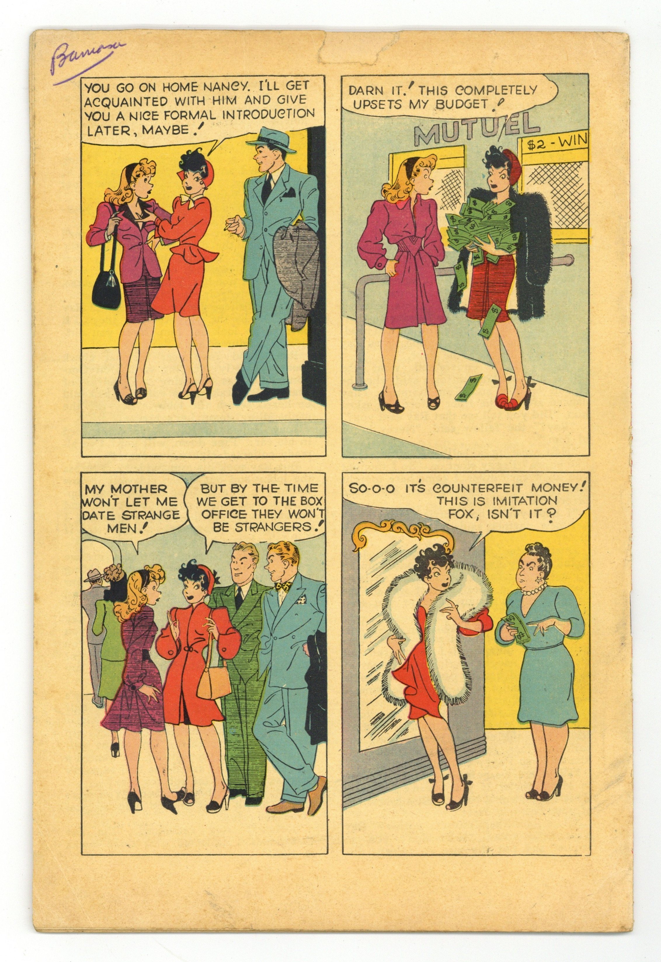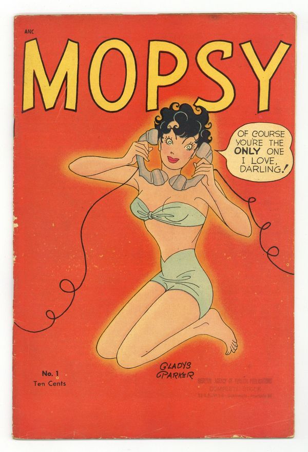 Cover by Gladys Parker. Stories and art by Gladys Parker, Fred Neher and Phyl Carroll. One of the first female-centric comic strips, by pioneering female artist Gladys Parker, Mopsy combines an Ever Meulen art style with pantomime-style gags and good-girl art. Mopsy gets a job as a "car hop" hoping to be discovered by a talent agent, in a story featuring lots of good-girl art. She succeeds in getting a screen test, but the part isn't what she's expecting. The backup strip, Fred Neher's Some Punkins, is a one-panel gag strip that also features good-girl art. Monkey Suit Magic; Mopsy; Some Punkins; Mopsy's Contest. 36 pages, Full Color. Cover price $0.10. Grade: VG 4.0 explanation of grade Condition: Used (collectible)