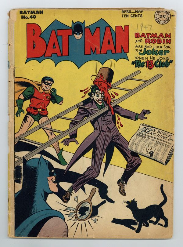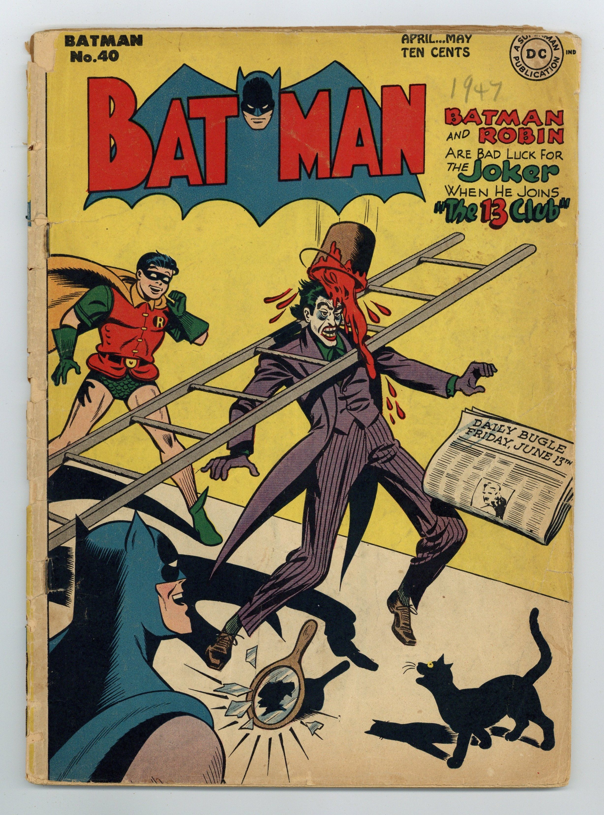 Cover pencils by Jack Burnley, inks by Charles Paris. "The 13 Club!", script by Bill Finger, pencils by Dick Sprang, inks by Gene McDonald; Batman joins the 13 Club, an outfit that disproves superstitions, to stop the Joker. "The Case of Batman II," pencils by Dick Sprang, inks by Gene McDonald; Robin and Alfred enlist a gymnast named Bill Randall to become Batman after Bruce Wayne dies. "Melody of Murder" text story by Tom Neill. 2-page Prof. Pipp story by Jack Farr. "The Grand Opera Murders!", pencils by Dick Sprang, inks by Gene McDonald; Batman and Robin see an accident at the opera that kills two actors; they investigate because it might be a crime. 52 Pages, Full Color. Cover price $0.10. Grade: GD 2.0 explanation of grade Condition: Used (collectible)
