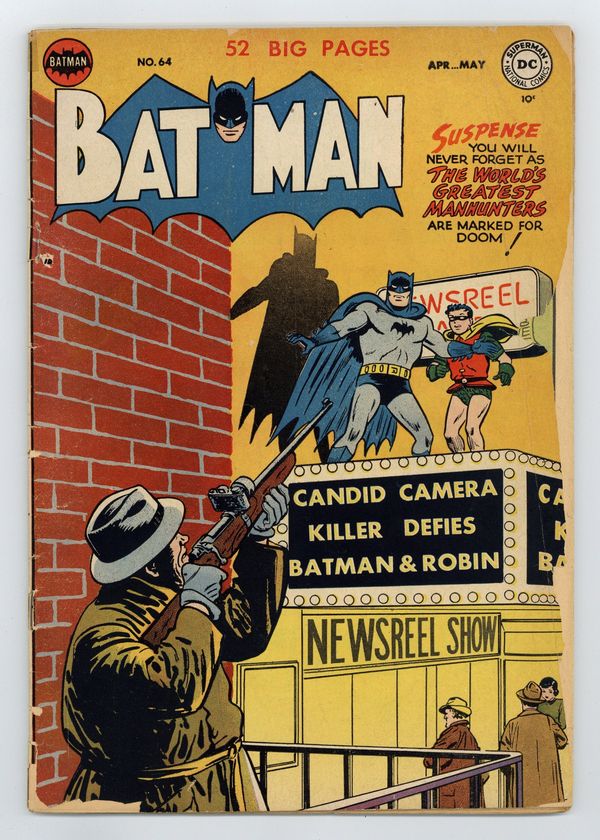 Cover by Win Mortimer. "The Candid Camera Killer!", pencils by Dick Sprang, inks by Charles Paris; Batman and Robin encounter an eccentric millionaire who collects pictures of crimes and criminals; His obsesssion makes him involved with criminals, and he is determined to get a picture of the deaths of Batman and Robin. "The Forgotten Men of Crime!", pencils by Bob Kane (Batman and Robin figures only) and Lew Sayre Schwartz, inks by Charles Paris; An elderly criminal is released from prison and tries to make a comeback in the underworld of Gotham City. One-page Casey the Cop story by Henry Boltinoff. A New Look In Racing article by Barbara Fairbanks, art by Raymond Perry. Shorty page by Henry Boltinoff. "The Return of Killer Moth!", script by Bill Finger, pencils by Bob Kane (Batman and Robin figures only) and Lew Sayre Schwartz, inks by Charles Paris; Killer Moth returns after two months in prison; He steals a moth collection so he can revive his shattered image; He becomes suspicious of Bruce Wayne being Batman. Human Rights for All public service announcement starring Superman, script by Jack Schiff, art by Win Mortimer. Half-page Peg story by Henry Boltinoff. 52 Pages, Full Color. Cover price $0.10. Grade: GD 2.0 explanation of grade Condition: Used (collectible)