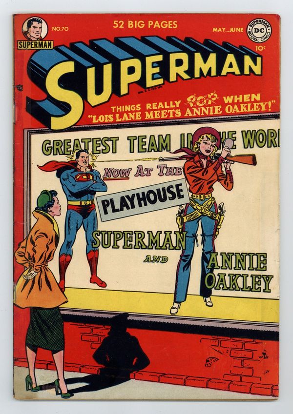 Cover pencils by Wayne Boring, inks by Stan Kaye. Lois Lane Meets Annie Oakley starring Superman and Annie Nichols (aka Annie Oakley), script by Alvin Schwartz, pencils by Wayne Boring, inks by Stan Kaye. The Life of Superman starring Charles Lamont and Angles Aldin, script by Edmond Hamilton, pencils by Wayne Boring, inks by Stan Kaye. Jerry the Jitterbug humor two-pager by Henry Boltinoff. The 'Copter Comes of Age text story. The Pied Piper Prankster starring Superman and The Prankster, script by Edmond Hamilton, pencils by Wayne Boring, inks by Stan Kaye. 52 Pages, Full Color. Cover price $0.10. Grade: GD 2.0 explanation of grade Condition: Used (collectible)