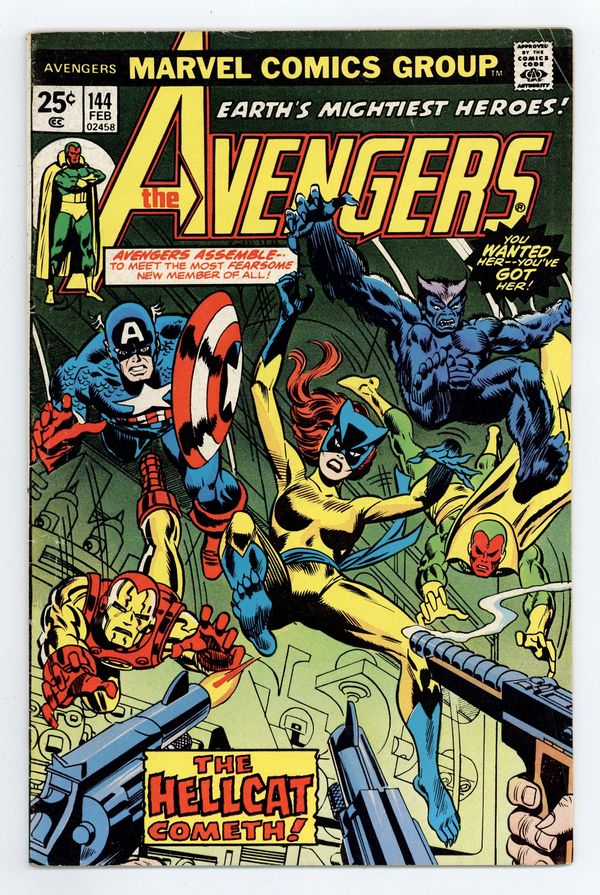 "Claws!" Part 4 of 7. First appearance of Hellcat. Script by Steve Englehart. Pencils by George Perez. Inks by Mike Esposito. Cover by Gil Kane and Frank Giacoia. The Avengers are free inside the Brand Corporation's Long Island facility! However, it doesn't take long for Hugh Jones and Buzz Baxter to locate them and activate the plant's internal military-grade weapons! During the missile attack, the Avengers are forced to split up. The Beast, Vision, and Scarlet Witch go one way...and Captain America, Iron Man, and Patsy Walker go another! When Shell-head comes across the former uniform of the Cat, the shield-slinger gets an idea! And in a dazzling transformation...Patsy Walker becomes Hellcat! The Avengers could use another hero on their side, because the rematch with Doctor Spectrum, the Golden Archer, Hyperion, Lady Lark, and the Whizzer is coming up fast! An excellent issue! The story (part 5) continues in Avengers 147. Origin of Patsy Walker. Cameo appearances by the Two-Gun Kid, Hawkeye, Moondragon, and Thor. Flashback cameos by the Fantastic Four, Spider-Man, and Tigra. (Notes: The letters page includes letters from comics writer Peter Gillis and comics writer Mary Jo Duffy, respectively. The letters page also contains Marvel Value Stamp Series B #39 Thor by Jack Kirby.) 36 pgs. Cover price $0.25. Grade: VG 4.0 explanation of grade Condition: Used (collectible)