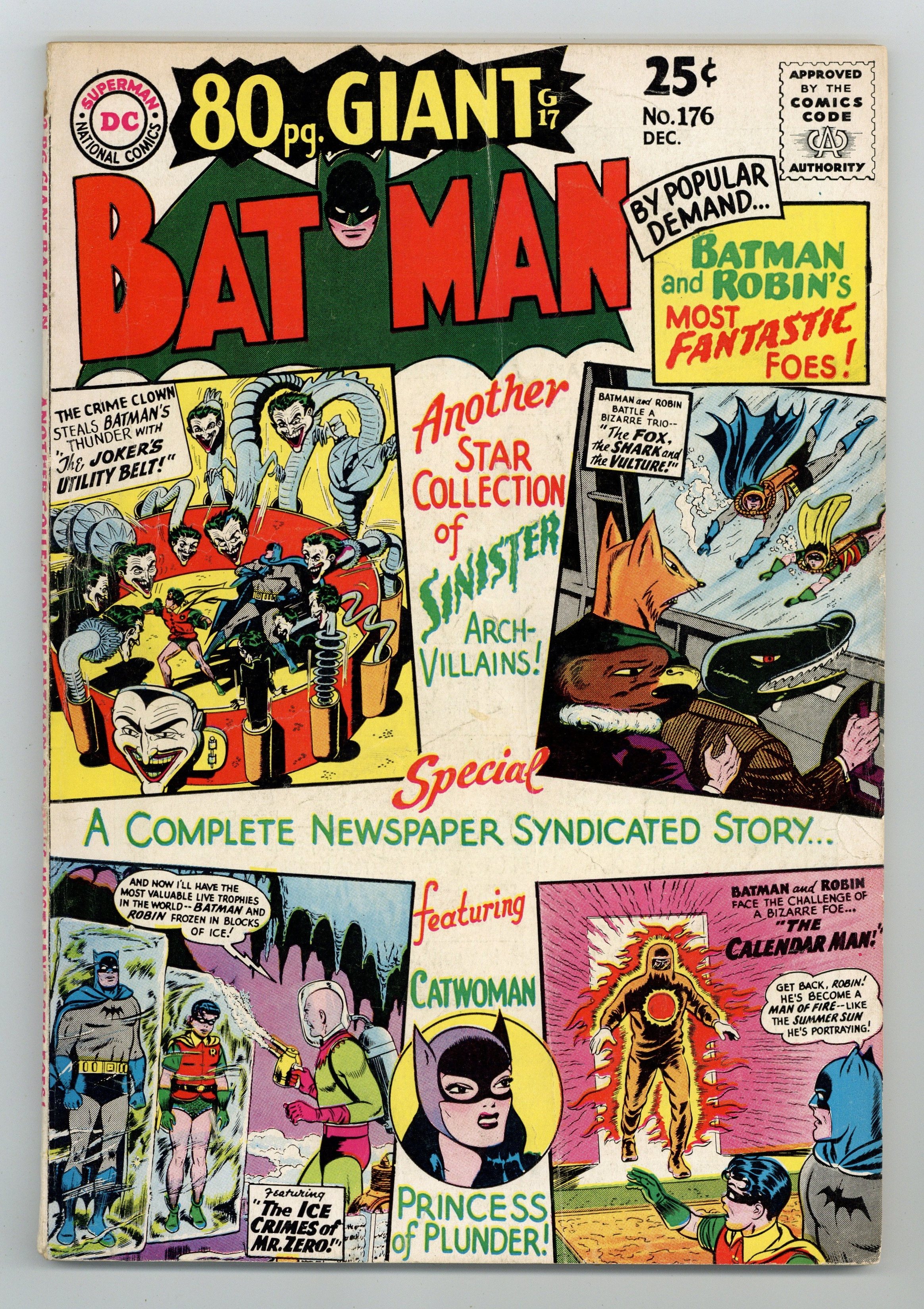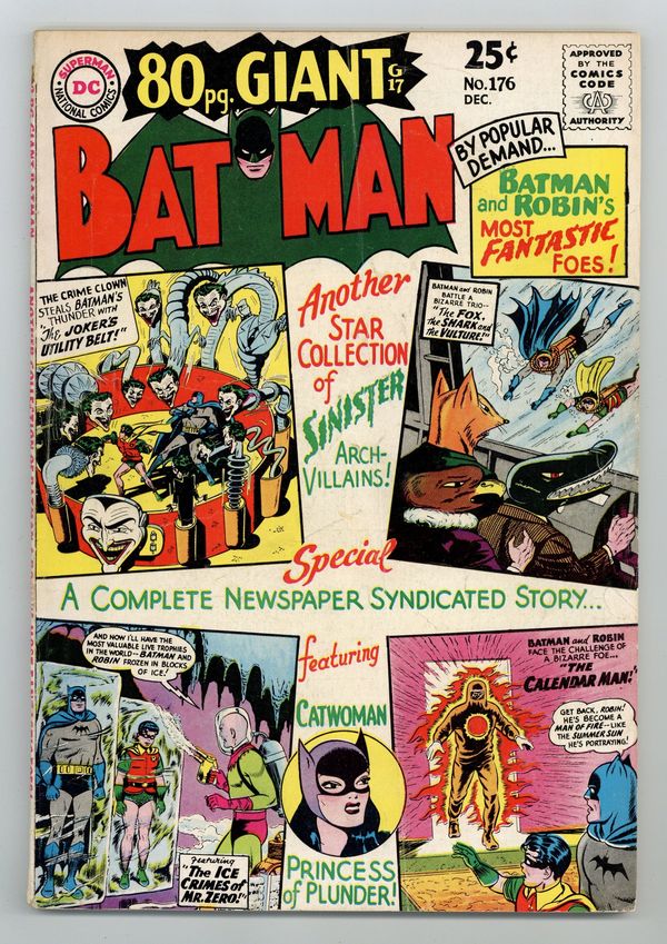 Reprints, 80-page giant. Cover pencils by Dick Sprang, Sheldon Moldoff, and Curt Swan, inks by Charles Paris and George Klein. "The Parasols of Plunder" (from Batman # 70) starring Batman and Penguin, script by Bill Woolfolk, pencils by Bob Kane and Lew Schwartz, inks by Charles Paris; The Penguin is released from prison on parole, providing he gives up anything having to do with birds; So he takes up an umbrella business. Builders of the Future! public service announcement about the importance of UNESCO funding in building schools in Africa, art by Sheldon Moldoff. "The Fox, The Shark, and the Vulture" (from Detective 253) starring Batman, script by Dave Wood, pencils by Sheldon Moldoff, inks by Charles Paris; A weird trio hijacks artifacts from a world tour of historical artifacts exhibit; A sharp witted Batman figures out the trio's lair and overcomes them . "The Ice Crimes of Mr. Zero" (from Batman 121) starring Batman and Mr. Zero (later Mr. Freeze), script by Dave Wood, pencils by Sheldon Moldoff, inks by Charles Paris; A scientist accidentally falls victim to the effects of an experiment, making him a virtual "human icicle," a foe who puts the chill on Batman and Robin. A complete Sunday newspaper syndicated story (8 pages) from April-June, 1946, Catwoman, Princess of Plunder!, script by Alvin Schwartz, pencils by Jack Burnley and Fred Ray, inks by Win Mortimer. Cap's Hobby Center activity page by Henry Boltinoff. "The Caveman at Large" (from Batman 102), script by Bill Finger, pencils by Sheldon Moldoff, inks by Charles Paris; A freak accident causes a great character actor to assume the character's persona he is dressed up to portray: a caveman! "The Challenge of the Calendar Man (from Detective 259), script by Bill Finger, pencils by Sheldon Moldoff, inks by Charles Paris; A new criminal, in trying to make a name for himself, challenges Batman to a duel of wits with all of his crimes being based on the "five" seasons. "The Joker's Utilty Belt" (from Batman 73), script by David Vern pencils by Dick Sprang, inks by Charles Paris; When the Joker's seemingly easy capture of the Caped Crusaders goes terribly wrong when Batman springs a surprise on him using his utility belt, the Crime Clown decides to outdo the Batman with his own utility belt! 84 Pages, Full Color. Cover price $0.25. Grade: GD/VG 3.0 explanation of grade Condition: Used (collectible)