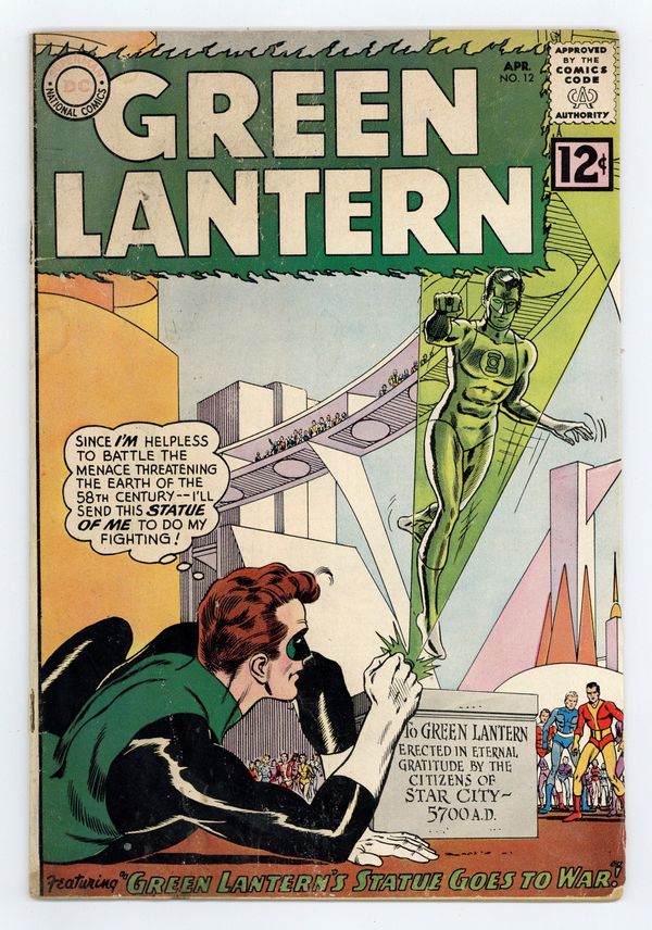 Cover pencils by Gil Kane, inks by Murphy Anderson. Green Lantern's Statue Goes to War!, script by John Broome, pencils by Gil Kane, inks by Joe Giella; Green Lantern is brought to the future again to assume his Pol Manning identity to discover why three generals are trying to overthrow the government. Zero Hour in the Silent City!, script by John Broome, pencils by Gil Kane, inks by Joe Giella; Green Lantern must discover what has stopped all sound in the city. 36 pgs. $0.12. Cover price $0.12. Grade: GD 2.0 explanation of grade Condition: Used (collectible)