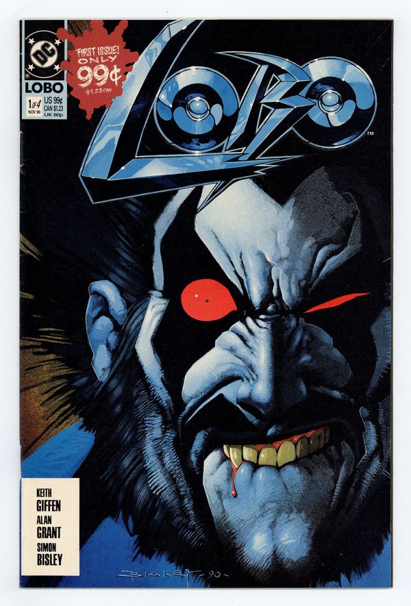 Starts Feb 16 Direct Edition. His name is Lobo. His job is intergalactic bounty hunter. His methods are insane. From the pages of L.E.G.I.O.N. '90 comes the wild, unchained, devil-may-care character you love to hate in his first solo mini-series. And if you thought he was out of control before, wait until you see what happens here. You see, Lobo is the last survivor of his race...an entire civilization that he personally annihilated just because he wanted to be unique in the universe. But Lobo seems to have missed one, and now that survivor's gone and written an unauthorized biography of Lobo, which doesn't make our maniac very happy. But what's really got Lobo miffed is that he's accepted a contract from L.E.G.I.O.N. to escort his biographer across the universe to their headquarters - delivered alive! Of course, Lobo manages to make a few enemies along the way, complicating his mission as these factions embark on a wild chase across the cosmos to see who will get to Lobo first. Written by Keith Giffen and Alan Grant, with art and painted cover by Simon Bisley. New Format. Cover price $0.99. Grade: FN+ 6.5 explanation of grade Condition: Used (collectible)