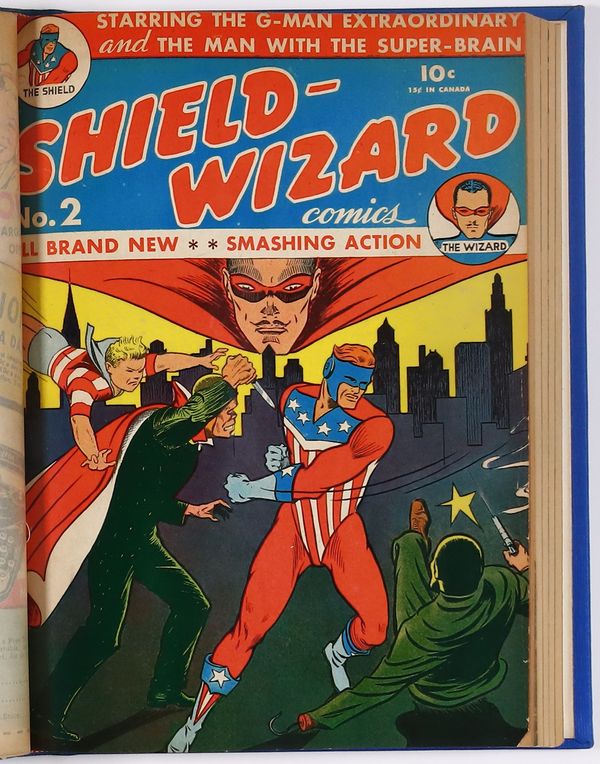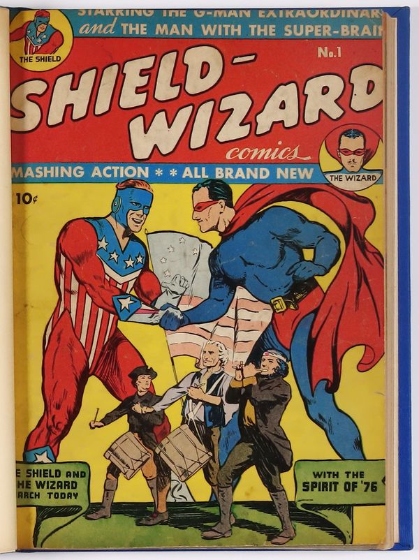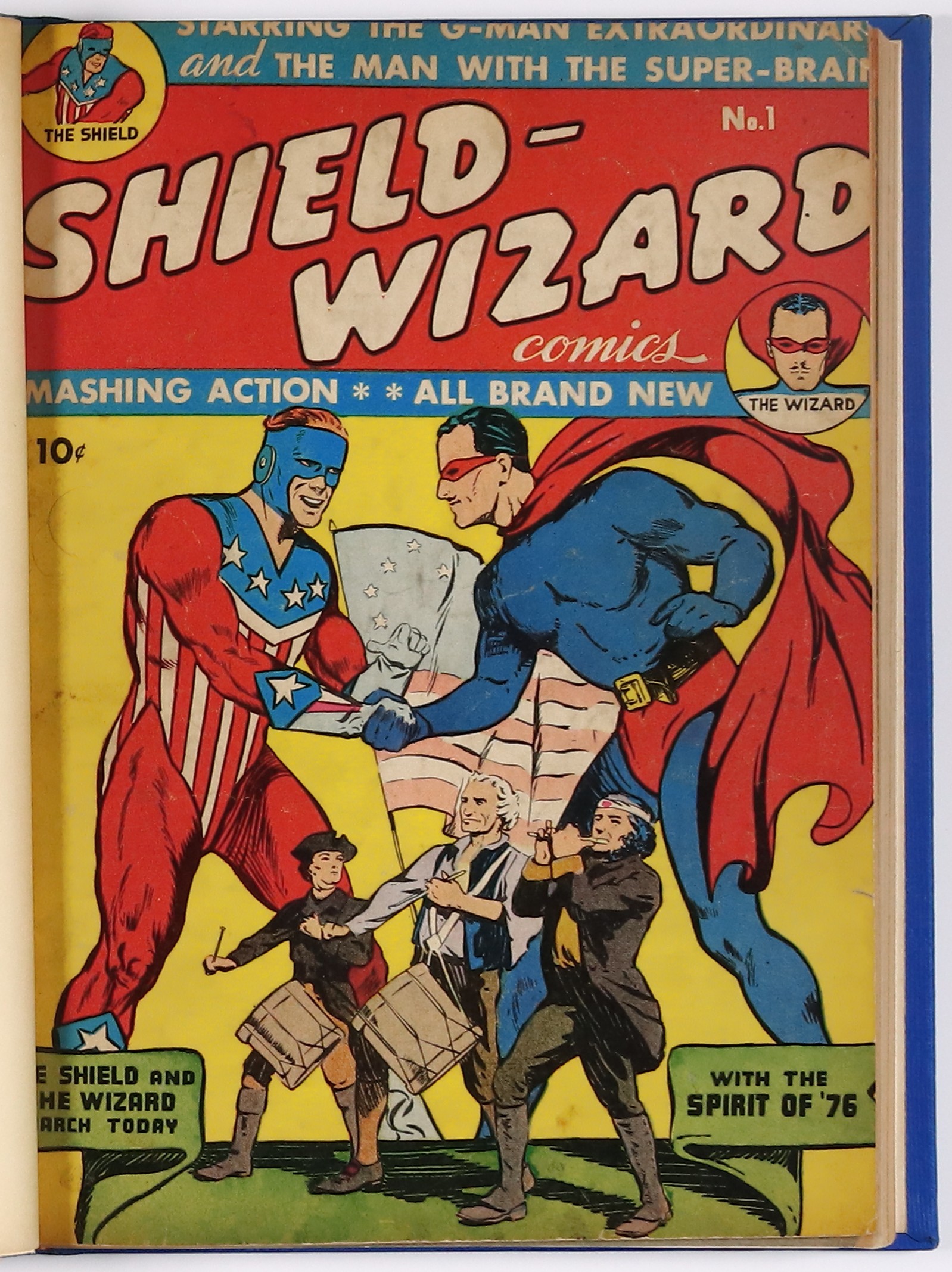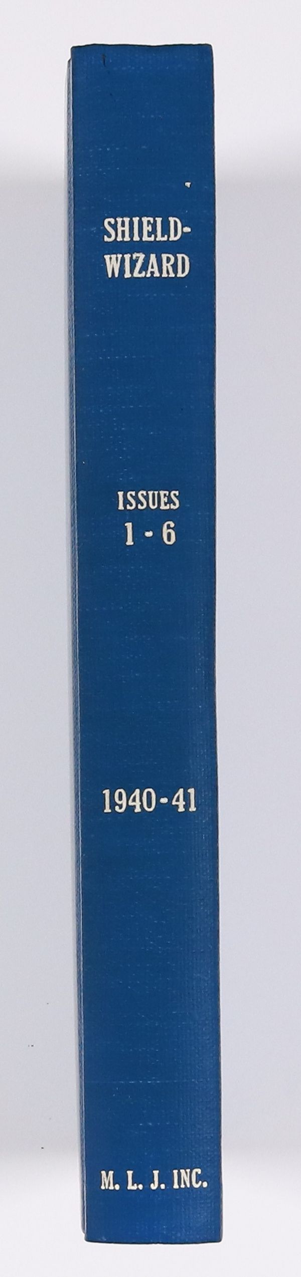 Personal library sticker and archival paper between issues bound in. Hardcover binding is laminated with art and in overall excellent condition with minor shelf discoloration. Outer spine labeled "Shield-Wizard - Issues 1-6 - 1940-41 - M. L. J. Inc.".