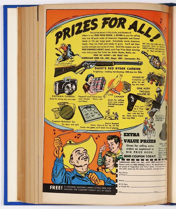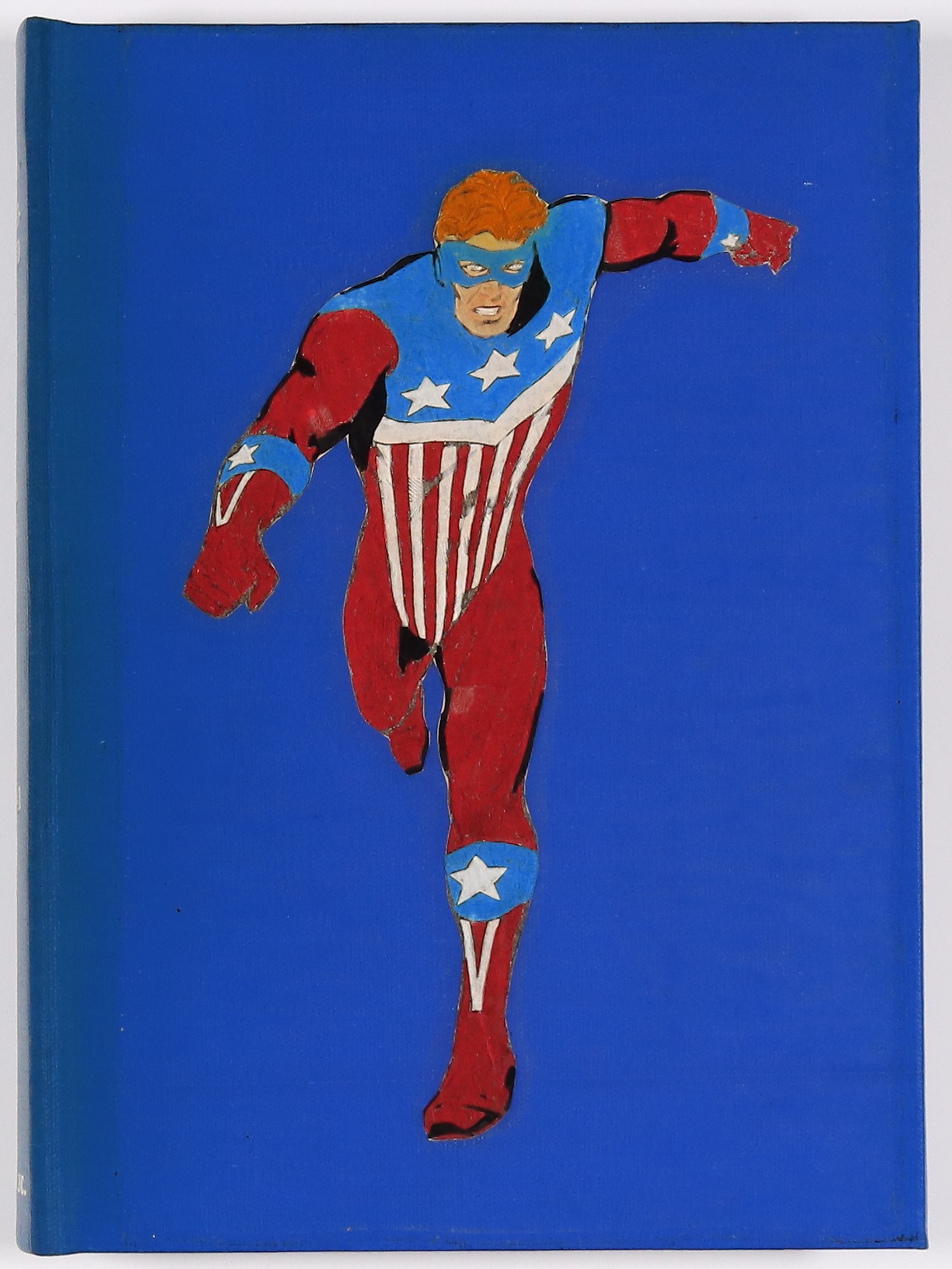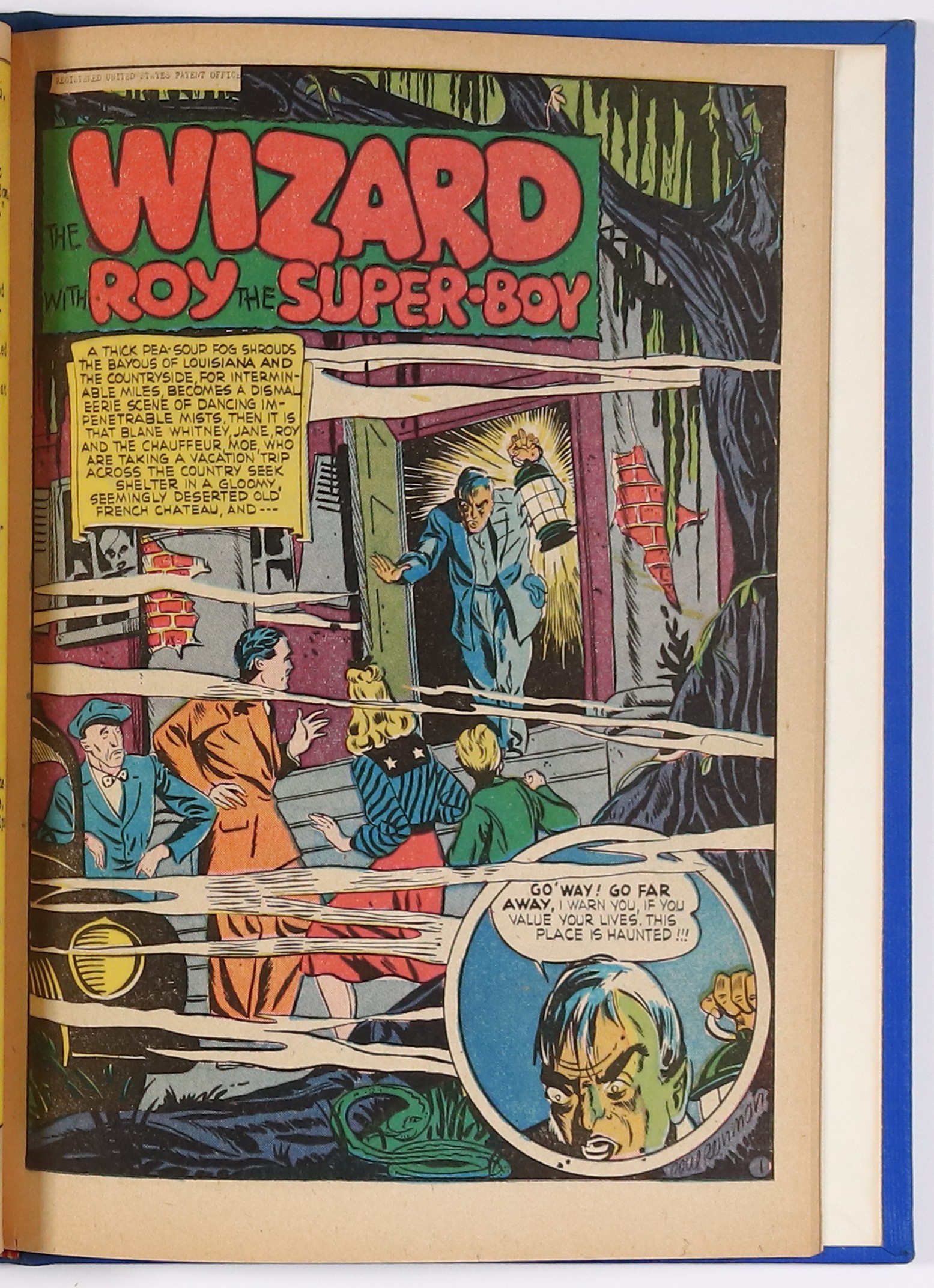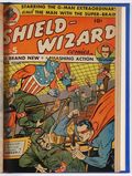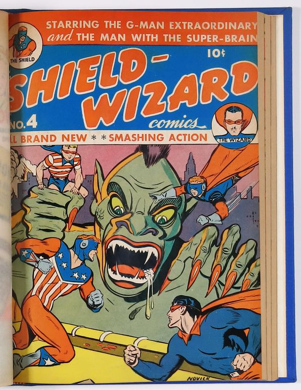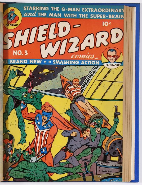 Personal library sticker and archival paper between issues bound in. Hardcover binding is laminated with art and in overall excellent condition with minor shelf discoloration. Outer spine labeled "Shield-Wizard - Issues 1-6 - 1940-41 - M. L. J. Inc.".