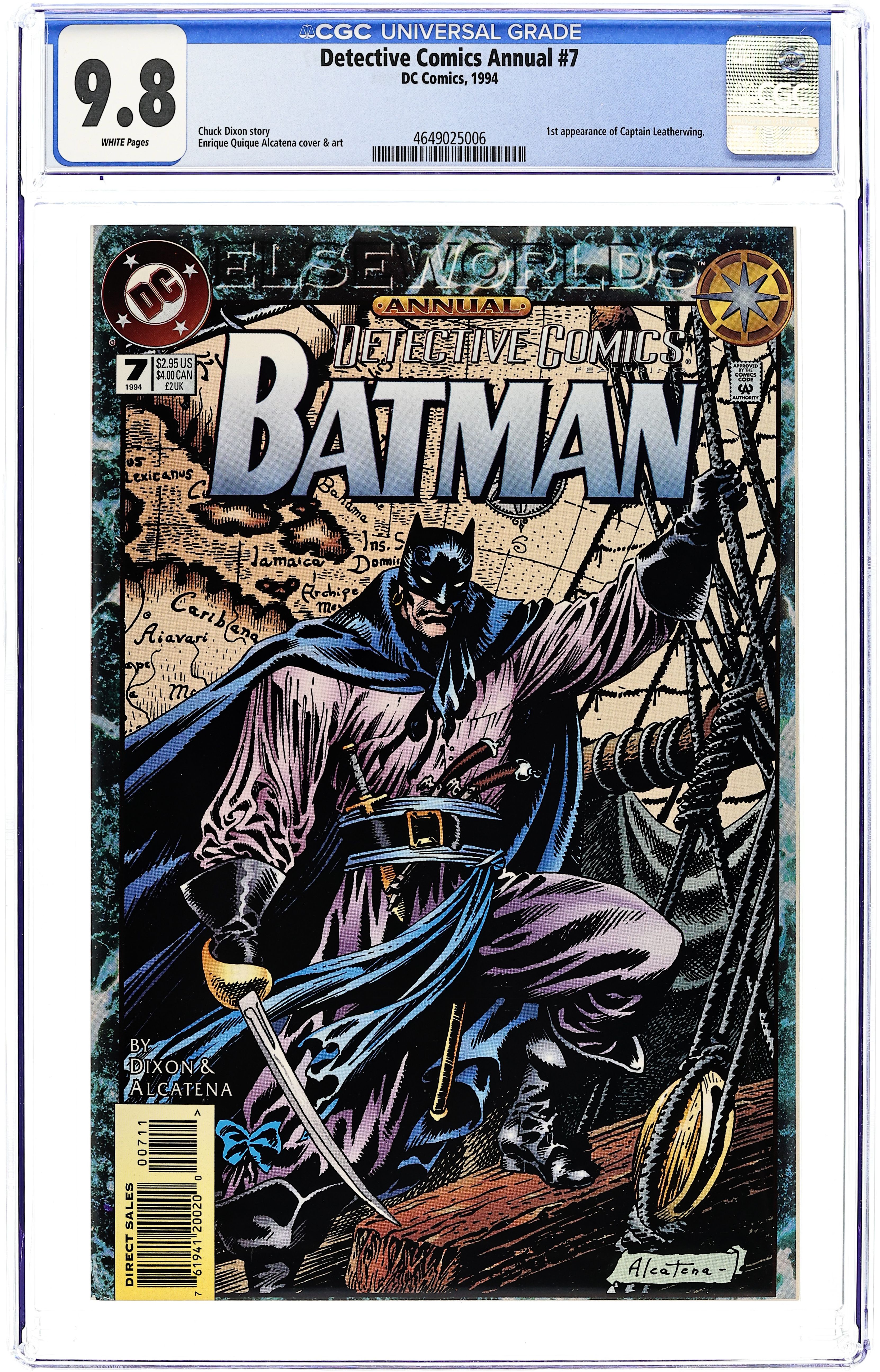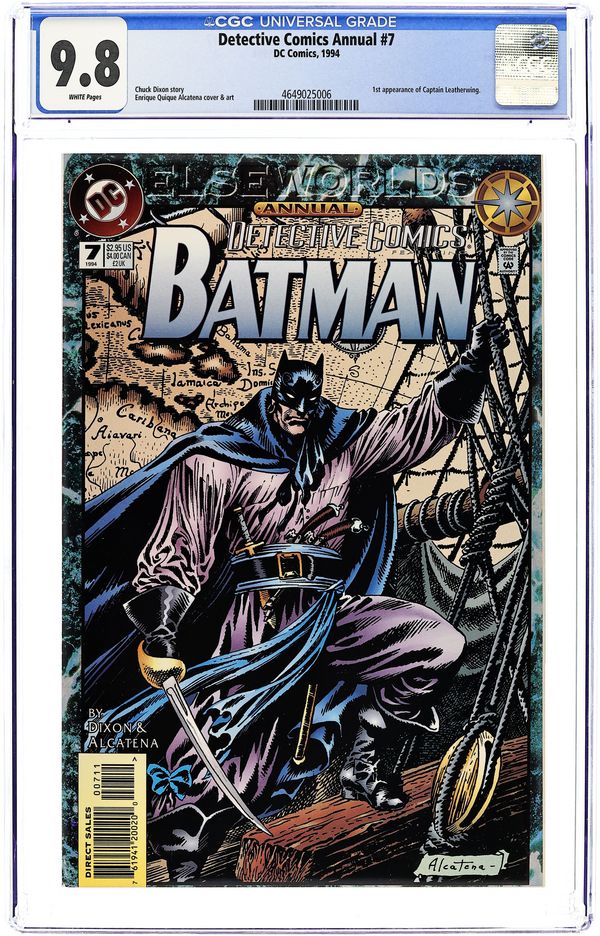 Starts Jan 26 The Elseworlds Annuals, the DC Universe's journey into remote realms of possibility, continue on the oceans of the 17th century, where the cowled pirate Leatherwing crosses swords with the evil plunderer, the Joker. It's adventure on the high seas with swordfights, cannonfire, stolen treasure...and a beautiful and dangerous pirate captain with particularly feline attributes. Written by Chuck Dixon, with art and cover by Alcatena. 68 pages. Cover price $2.95. Grade: CGC 9.8 explanation of grade Condition: Used (collectible)