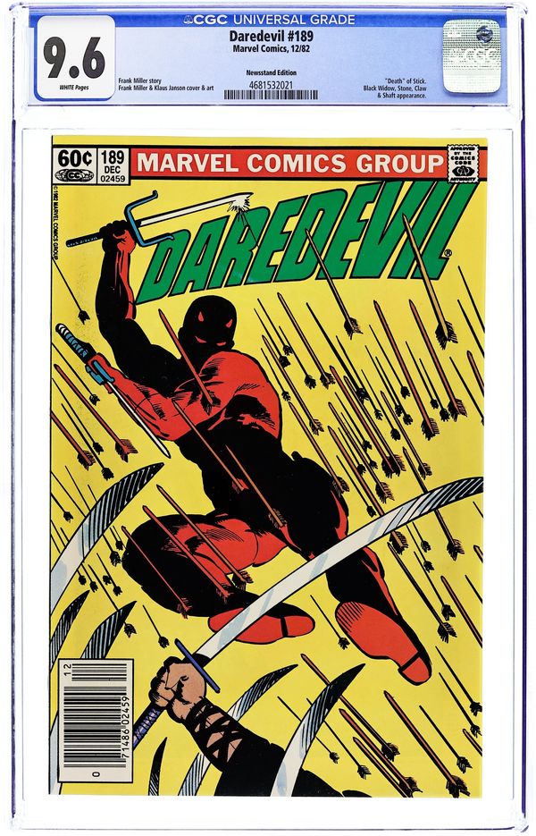 Starts Mar 2 Newsstand Edition. Cover pencils by Frank Miller, inks by Klaus Janson. Siege, script by Frank Miller, pencils by Frank Miller (layouts) and Klaus Janson (finished art), inks by Klaus Janson; The Black Widow dies but is resurrected by Stone; DD and company have a free for all with the Hand in which Stick gives his life to save Matt; Widow and Foggy break up Heather and Matt; Stone tells DD that the Hand plans on resurrecting Elektra. Promo for next issue with Elektra replaces letters page, art by Miller. 36 pgs. Cover price $0.60. Cover price $0.60. Grade: CGC 9.6 explanation of grade Condition: Used (collectible)