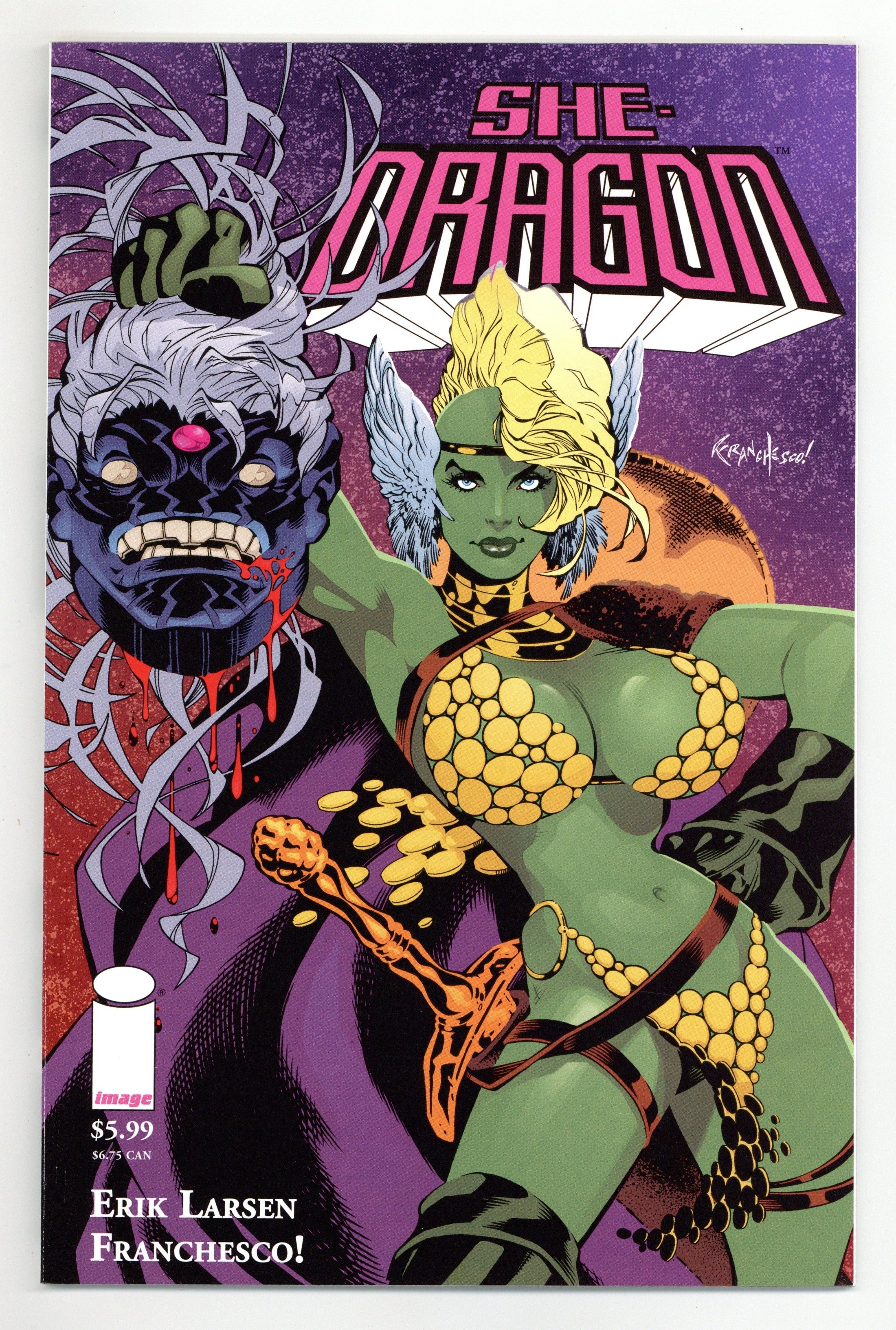 Full color, 48 pages Written by ERIK LARSEN. Art & cover by FRANCHESCO! She-Dragon in her own book at last! Savage Dragon's curvaceous counterpart on her own! Hurled into the dangerous Dimension-X by the diminutive death-dealing dictator known as Mr. Glum, Amy Belcher must fight for her life against dangers aplenty. The ever-sensational She-Dragon fights for survival in a deadly dimension where monsters dwell and creatures are on the loose! She-Dragon has a quest: to get across Dimension-X to Mr. Glum's planet in hopes of finding her way back to Earth. A thousand dangers stand between her and goal, and surprising allies come to her aid. Featuring the malevolent menace of Killmore the Cruel! The return of Savage Dragon's son, Malcolm Eugene Jackson Dragon! And the awe-inspiring art of FRANCHESCO! As a special bonus: a sneak peek behind the scenes featuring a look at creator ERIK LARSEN's layouts for this pulse-pounding project! No SAVAGE DRAGON fan should be without it! Cover price $5.99. Grade: VF- 7.5 explanation of grade Condition: Used (collectible)