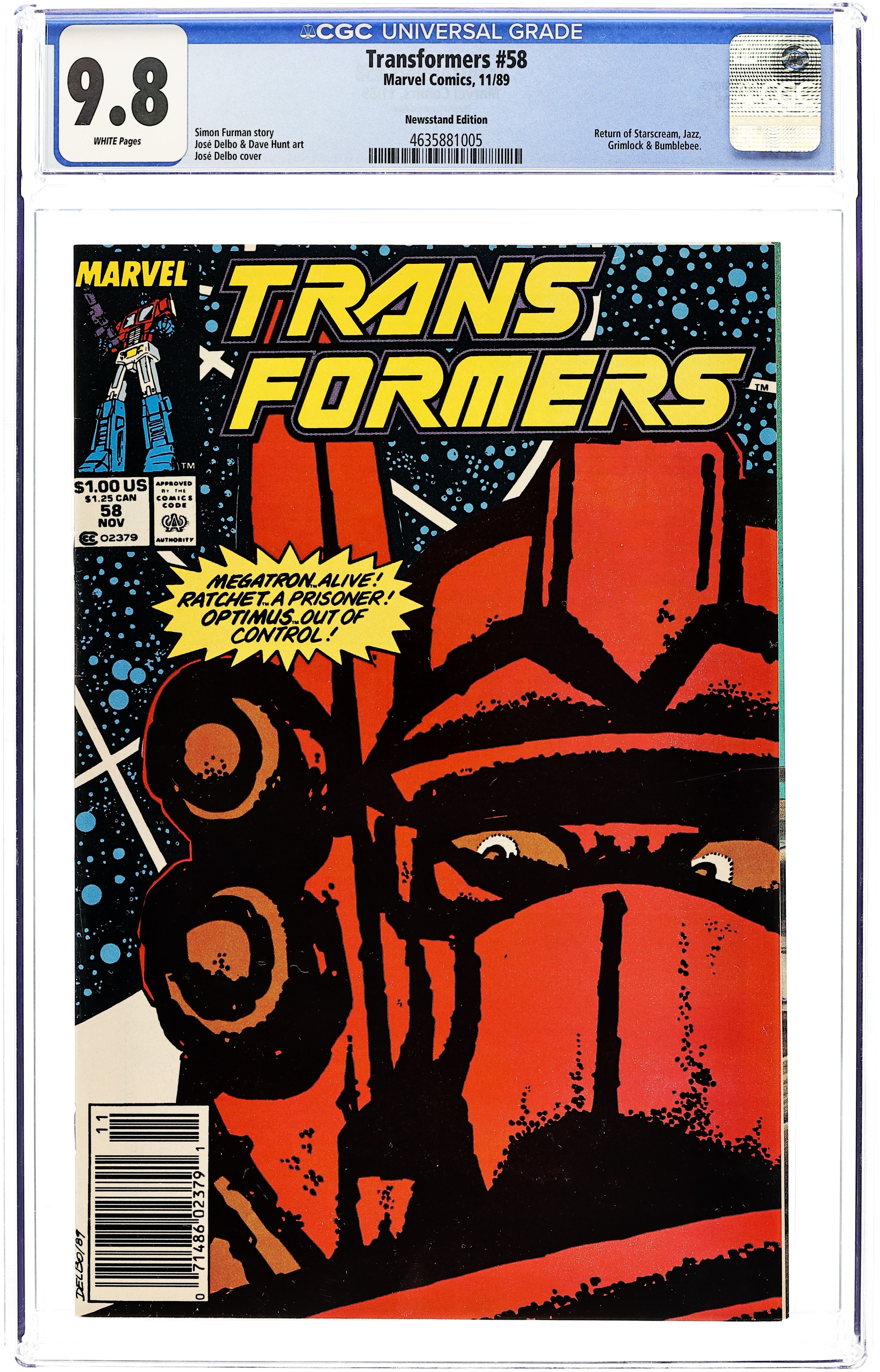 Newsstand Edition. "All the Familiar Faces!" Megatron...alive! Ratchet...a prisoner! Optimus...out of control! Written by Simon Furman, with art by Jose Delbo and Dave Hunt. Cover by Jose Delbo. Cover price $1.00. Grade: CGC 9.8 explanation of grade Condition: Used (collectible)