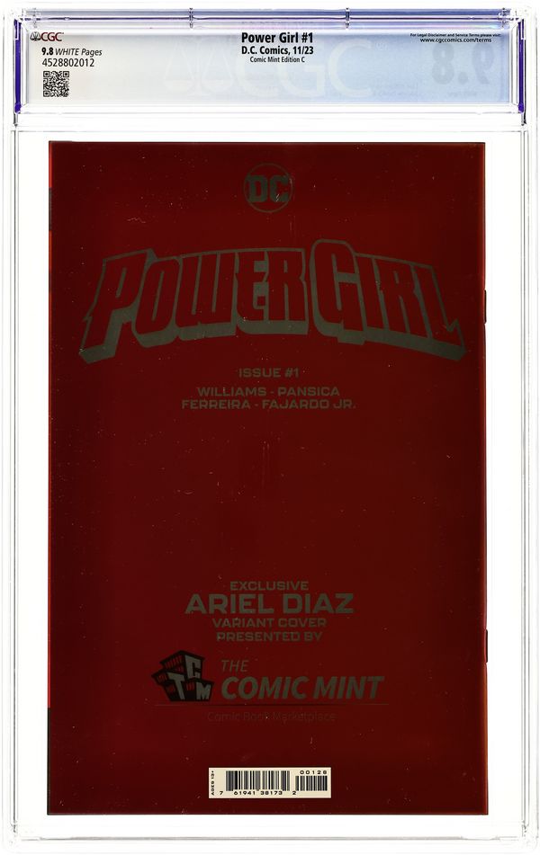The Comic Mint Exclusive Foil Edition Virgin Cover by Ariel Diaz. Written by Leah Williams. Art by Eduardo Pansica, Julio Ferreira. PRETTY, PUNCHY, AND POWERFUL! After the events of Knight Terrors, a long-dormant Kryptonian threat has returned to take down Superman and his family. Who could possibly stop it? Well, according to the Man of Steel, its Power Girl! Witness a road trip race against time as Paige reconnects with her roots to save the world from her deadly past. Power Girl Special writer Leah Williams returns with artist Eduardo Pansica (Supergirl) for an ongoing series of epic proportions! 32 pages, full color. Rated T+ Grade: CGC 9.8 explanation of grade Condition: Used (collectible)
