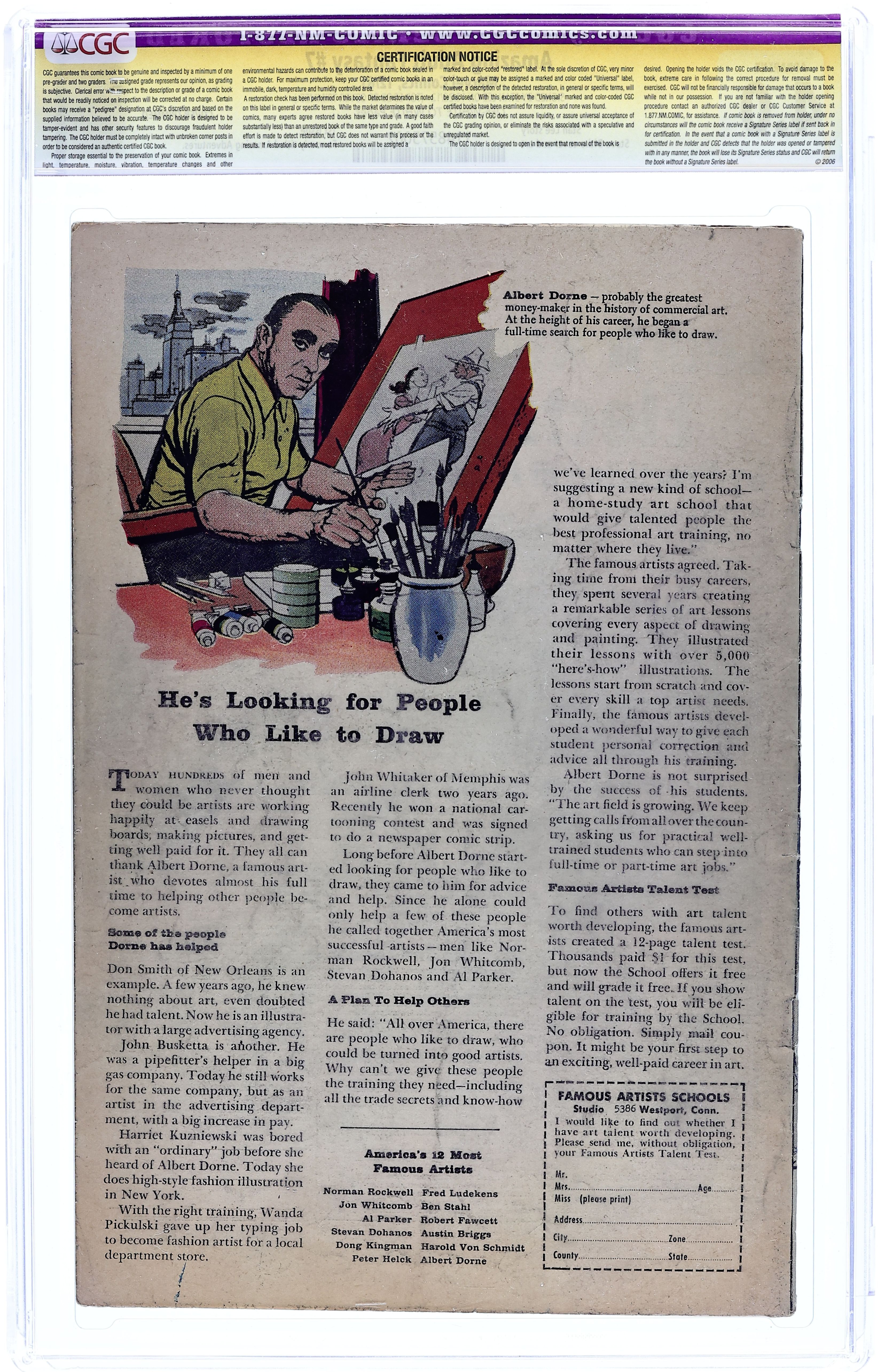 Ends Feb 23 7:09 PM CST Bid History 7 bids Current Bid $234 Your Secret Max Bid If you'd like to bid, please log in or register. Cover art by Steve Ditko. Why Won't They Believe Me?, script by Stan Lee, art by Steve Ditko; A man believes that he has discovered an alien invasion, but he is the real alien, and has amnesia. The Last Man on Earth; A paranoid man seals himself in a bomb shelter, but instead of a war, he misses the discovery of immortality in space and the exodus of humanity. Witch Hunt; A woman accused of witchcraft is exonerated, but discovers that her fiancé really is a witch. Journey's End. The Icy Fingers of Fear. All scripts by Stan Lee, all art by Steve Ditko. Every issue in this title contains wonderful O. Henry-style stores. This series was great while it lasted, but it was short-lived because Stan admitted he couldn't come up with twist-ending stories fast enough to meet the grinding monthly publishing deadlines. Little wonder, as he was also writing most other Marvel titles at the time. 36 pgs. $0.10. Cover price $0.12. Grade: CGC 4.0 explanation of grade Condition: Used (collectible)