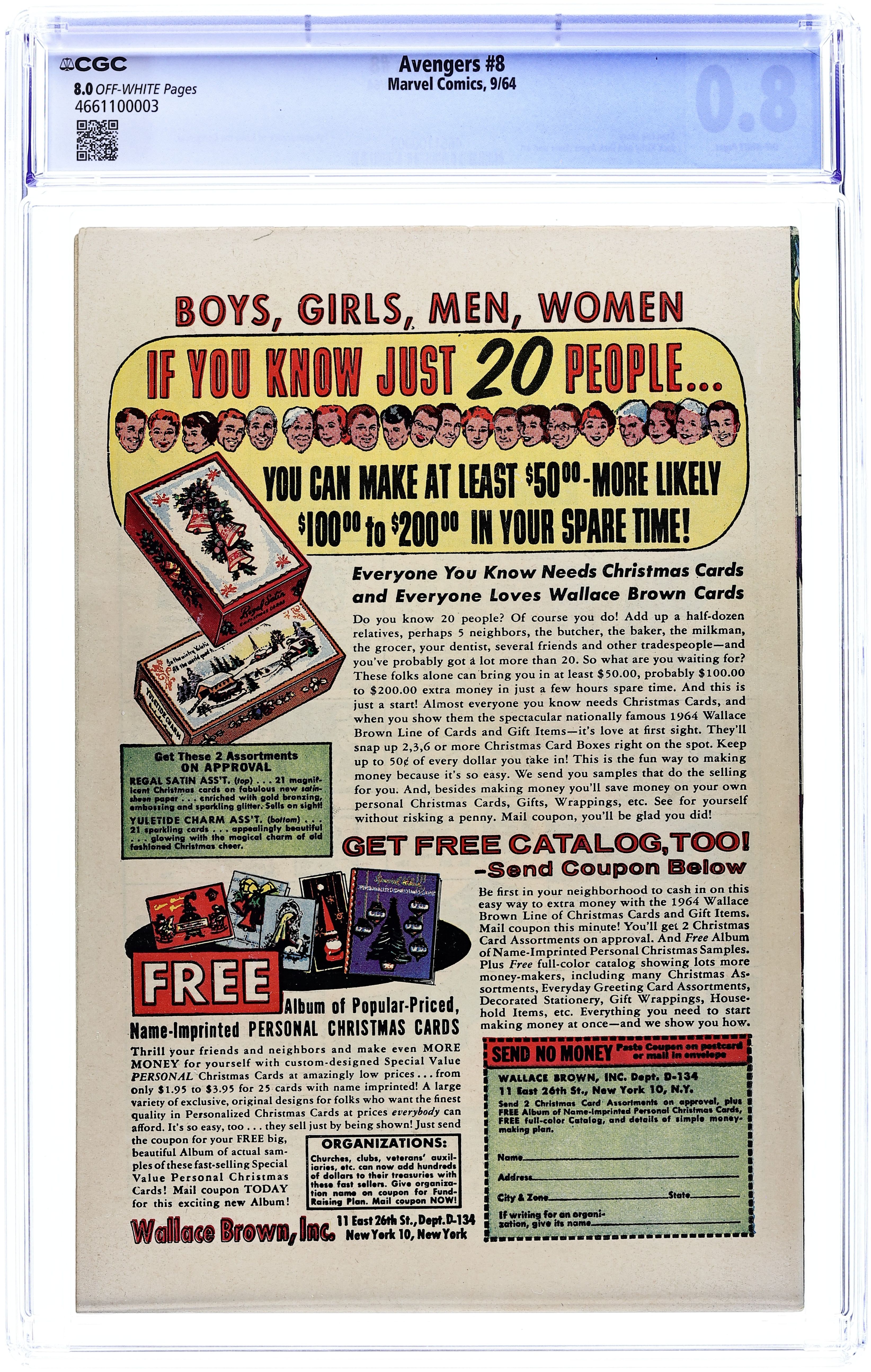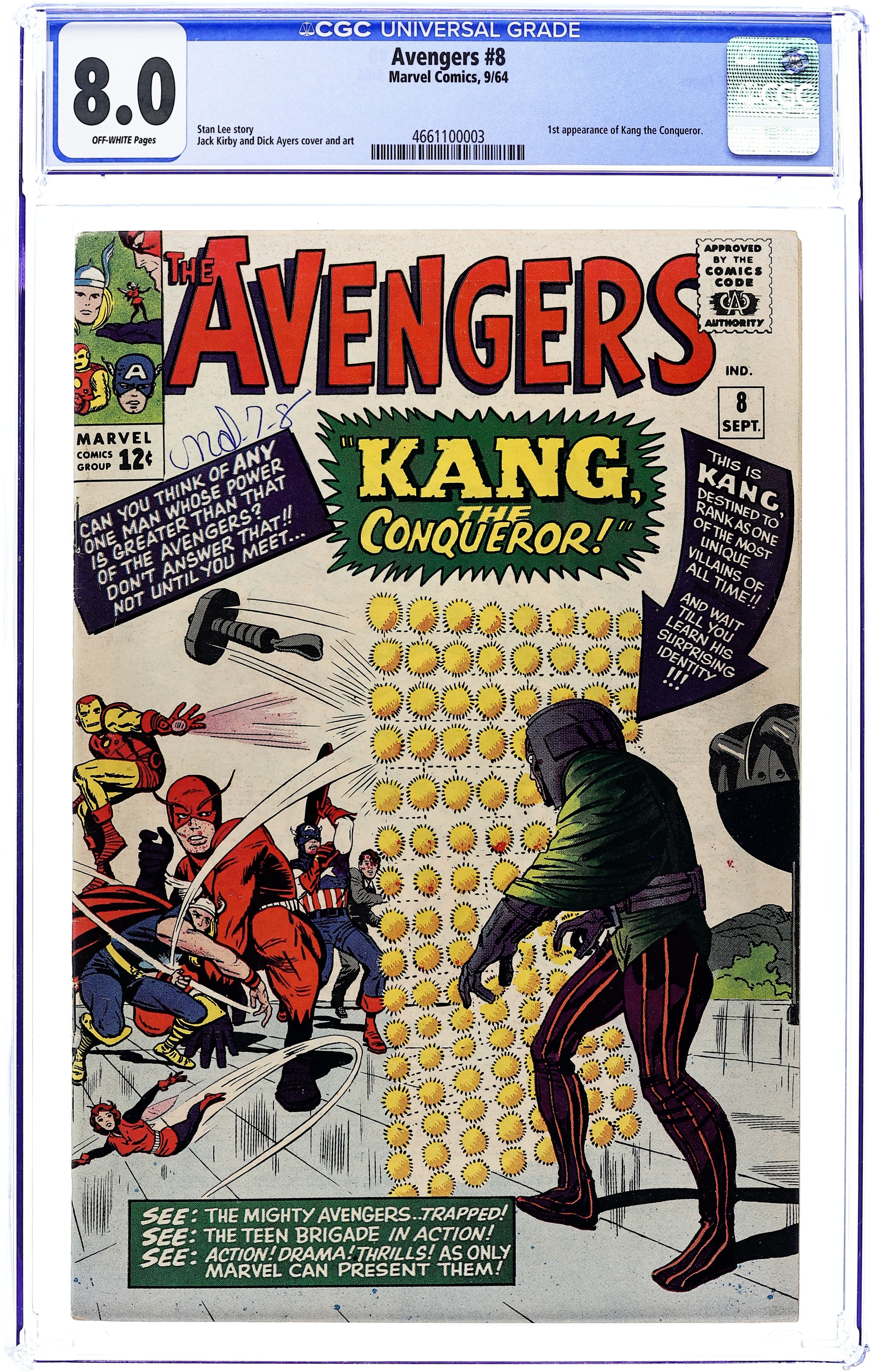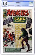 Cover pencils by Jack Kirby, inks by Dick Ayers. Kang, The Conqueror!, script by Stan Lee, pencils by Jack Kirby, inks by Vince Colletta cover; Kang appears and demands to be made ruler of the Earth; The Avengers attempt to stop him, but it comes down to Wasp and the Teen Brigade to slow Kang long enough for the rest of the Avengers to free themselves and put an end to Kang's threat. Roster: Captain America, Thor, Iron Man, Wasp, Giant-Man, and Rick Jones. First appearance of Kang. 36 pgs. $0.12. Cover price $0.12. Grade: CGC 8.0 explanation of grade Condition: Used (collectible)