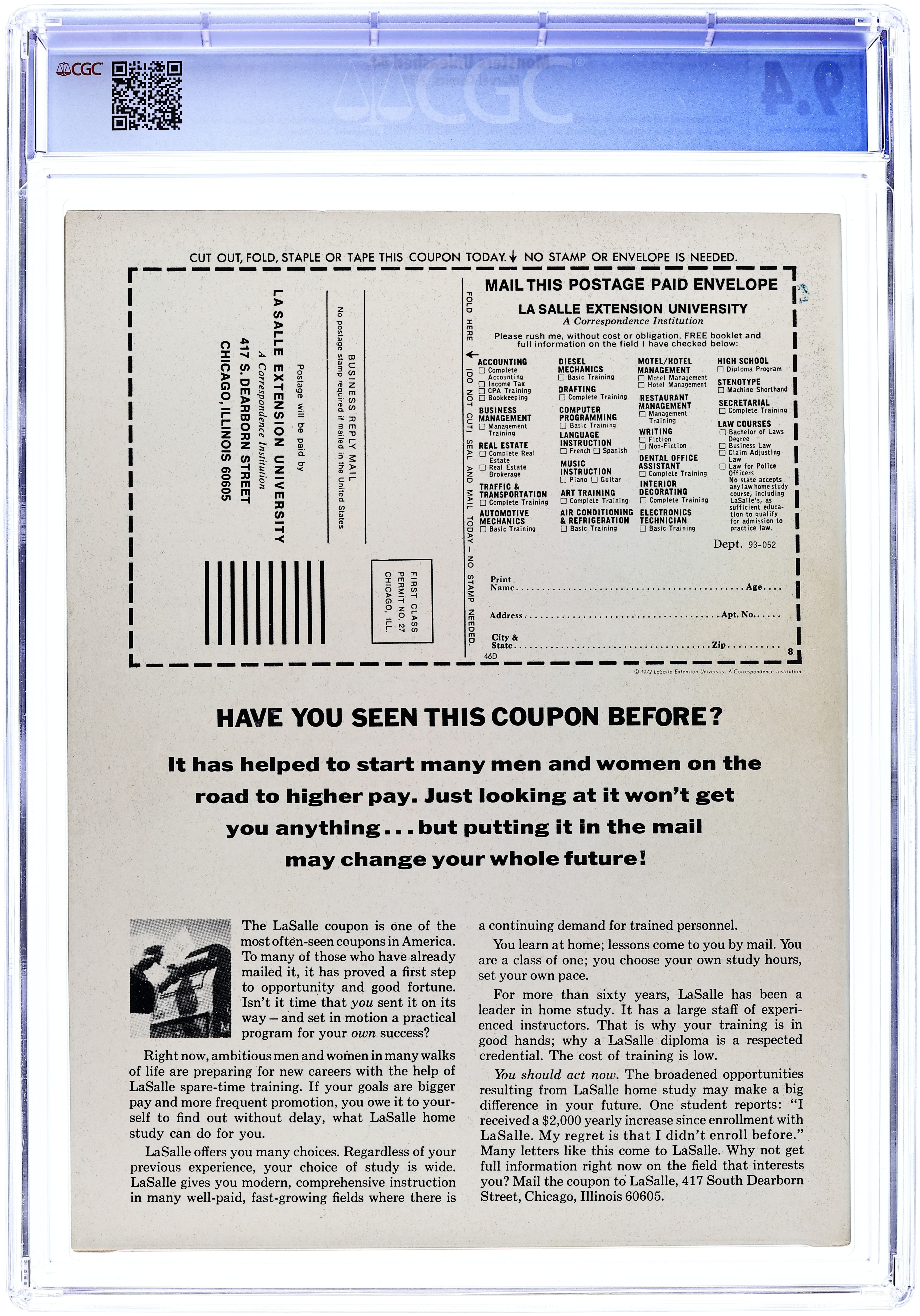 1st Appearance of Satanna. Edited by Roy Thomas. Cover by Frank Brunner. The Classic Monster!, script by Gary Friedrich, art by John Buscema, Syd Shores, and Win Mortimer; Derek removes the brain from the Frankenstein Monster and replaces it with the brain from Dr. Wallach. The Hands!, script by Stan Lee, art by Gene Colan. Our Martian Heritage text story by Chris Claremont. A Monster Reborn!, script by Steve Gerber, art by Pablo Marcos. The Killers, art by Bernie Krigstein. To Love, Honor, Cherish... ...'Til Death!, script by Chris Claremont, art by Don Perlin. 76 pgs., color. $0.75. Cover price $0.75. Grade: CGC 9.4 explanation of grade Condition: Used (collectible)