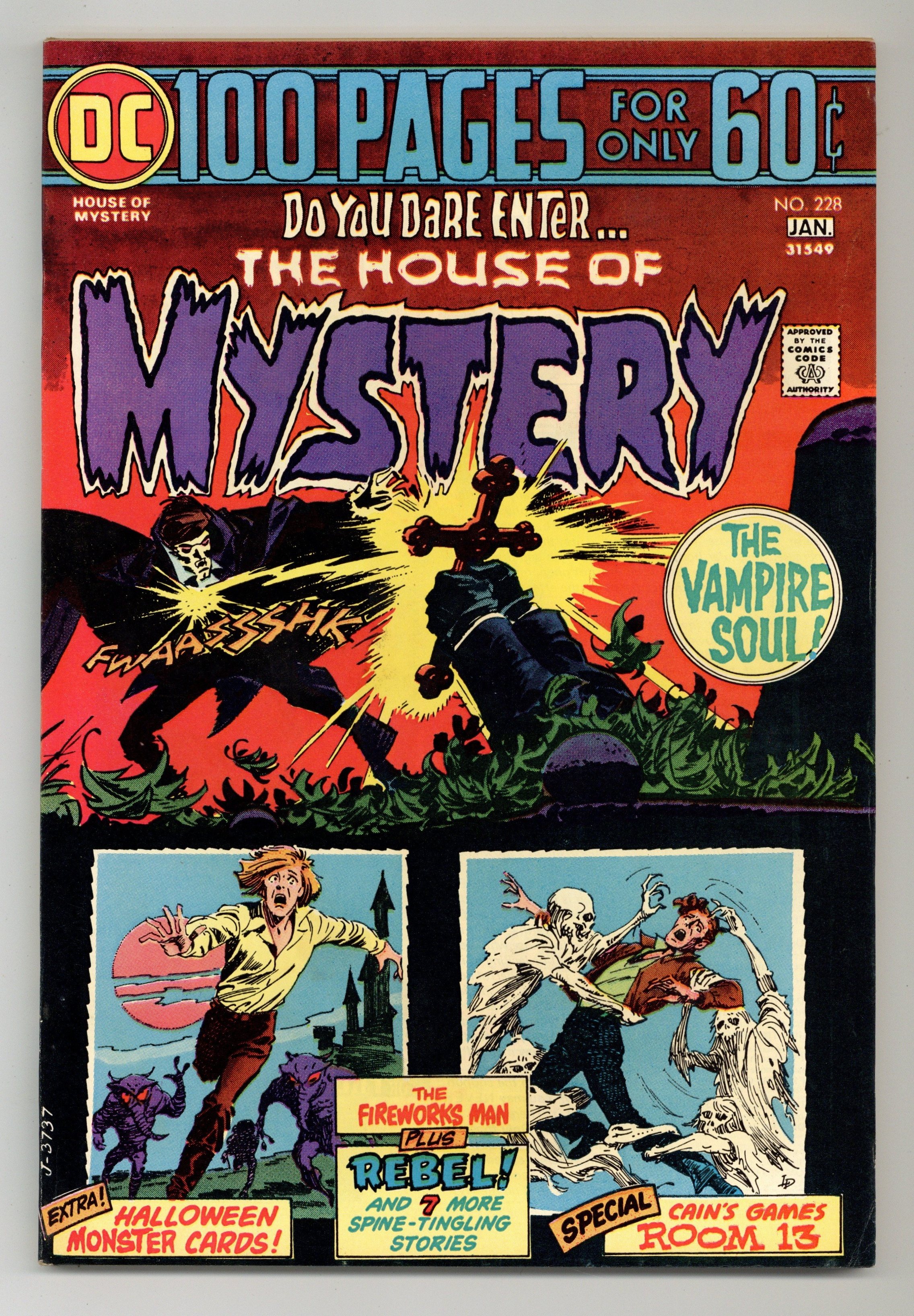100-page giant. Featuring: 1 page preface drawn by Alfredo Alcala; 9 page story "The Wisdom of Many, The Wit of One" written by Doug Moench (plot) & Frank Robbins and drawn by Frank Robbins; 1 page Cain's Game Room filler drawn by Sergio Aragones; 5 page reprint story "Stamps of Doom!" drawn by Ruben Moreira; 4 page story "The Rebel" written by Michael Pellowski (plot) & Maxene Fabe and drawn by Alan Kupperberg & Neal Adams; 7 page reprint story "The Wizard's Revenge" drawn by Bill Ely; 3 page Cain's True Case Files reprint story "The Man Who Murdered Himself!" written by Otto Binder and drawn by Berni Wrightson; 1 page crossword activity "House of Mystery Hidden Message" by Bob Rozakis; 2 page filler "Halloween Monster Cards" starring Cain and Swamp Thing, featuring images from other DC horror comics with humorous blurbs; 1 page Cain's Game Room story drawn by Sergio Aragones; 11 page story "A Coffin for Bonnie and Clyde!" written by Robert Kanigher and drawn by Jack Sparling; Half page text article "Attention College Students!" which comments on getting DC magazines into university bookstores; 6 page reprint story "The Dragon of Times Square" drawn by Bob Brown; 1 page Room 13 filler "Free! A Lucky Room 13 Amulet for You!" drawn by Sergio Aragones; 6 page reprint story "Seven Steps to the Unknown" drawn by Bill Ely; 7 page reprint story "Wheel of Fate!" drawn by Carmine Infantino and Frank Giacoia; 12 page story "The Fireworks Man!" written by Russell Carley (script continuity) & Michael Fleisher and drawn by Gerry Talaoc. 100 Pages, Full Color. Cover price $0.60. Grade: VF- 7.5 explanation of grade Condition: Used (collectible)