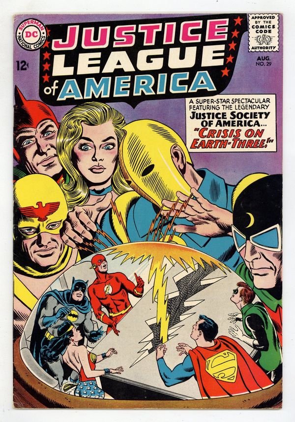 Cover pencils by Mike Sekowsky, inks by Murphy Anderson. Crisis on Earth-Three, script by Gardner Fox, pencils by Mike Sekowsky, inks by Bernard Sachs; The Crime Syndicate is so bored of life on their Earth as supreme villains, designated as Earth-3, that they come to the JLA's Earth for a new challenge after Ultraman accidentally discovers it when exposed to Green Kryptonite (which gives him a new power with every exposure to it); Just as it looks like the JLA has the upper hand, the Crime Syndicate teleports them to Earth-3, where they have the advantage; To secure a level battlefield the Crime Syndicate plans to go to the Earth-2 and eliminate the JSA. 1st Silver Age appearance of Star Man; Justice Society cross-over. Rocky and Bullwinkle star in a one-page Cheerios ad. 36 pgs. $0.12. Cover price $0.12. Grade: FN- 5.5 explanation of grade Condition: Used (collectible)
