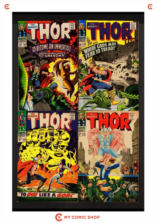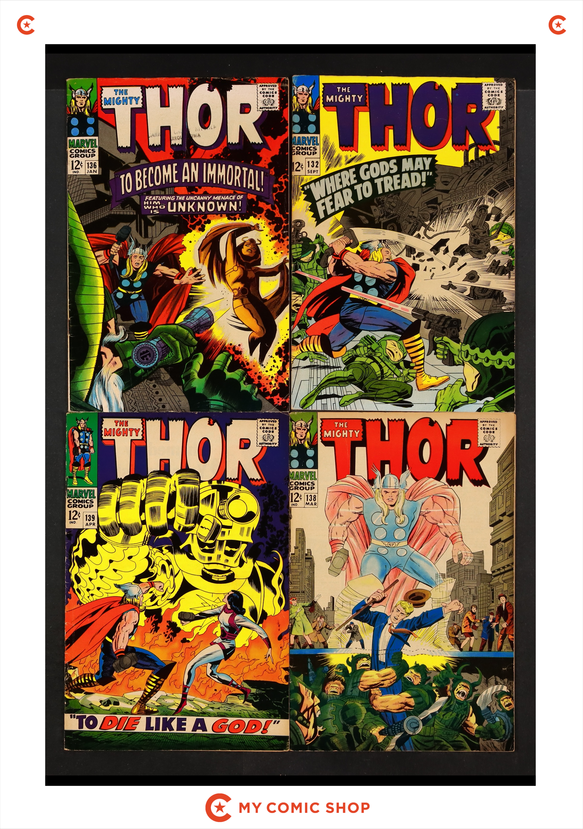 Issues 132, 136, 138, 139 of Thor (1962 Marvel 1st Series Journey Into Mystery). Most will grade in the VG to VG/FN range.