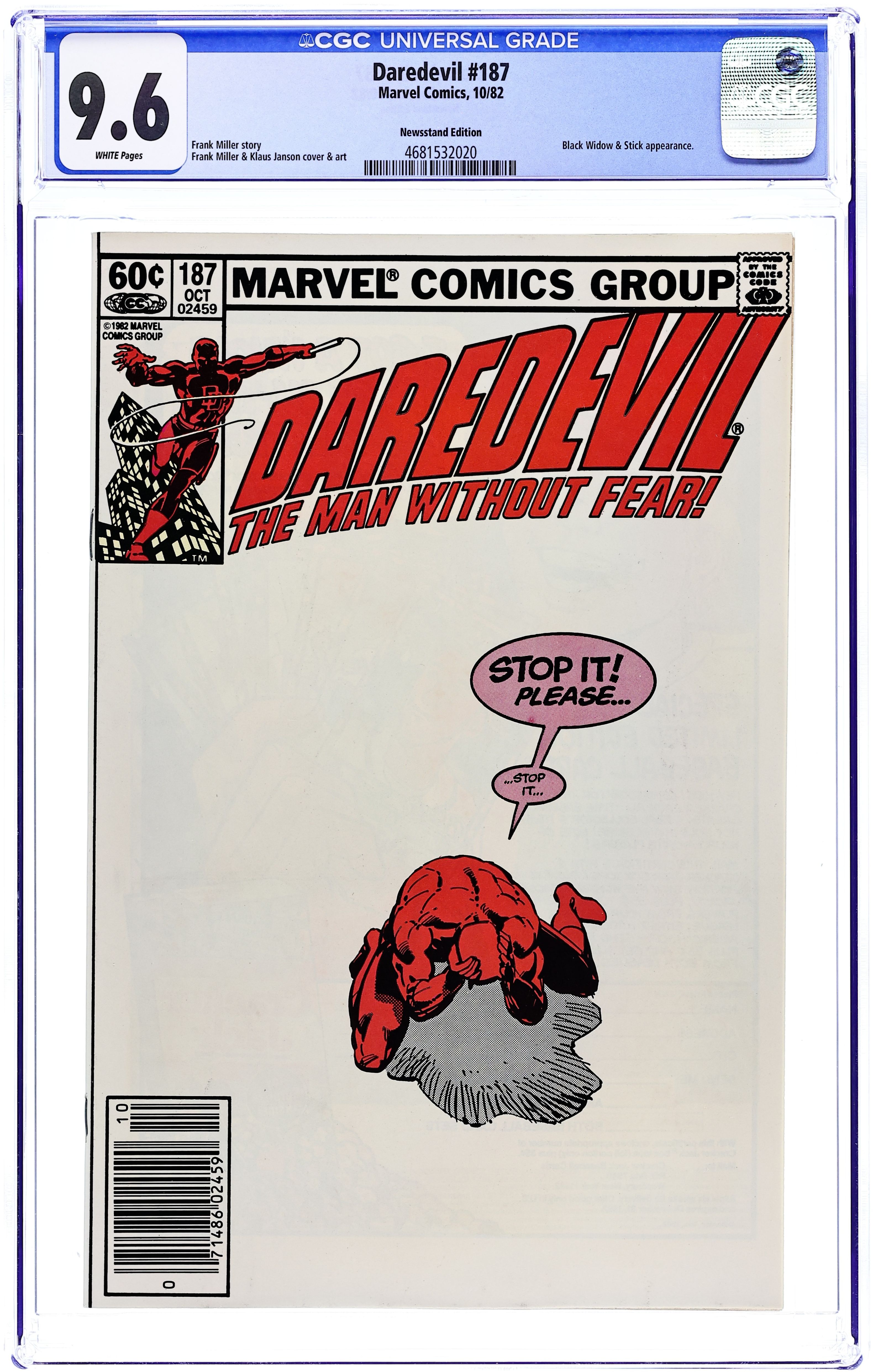 Ends Feb 23 7:52 PM CST Bid History 3 bids Current Bid $12 Your Secret Max Bid If you'd like to bid, please log in or register. Newsstand Edition. Cover pencils by Frank Miller, inks by Klaus Janson. Overkill, script by Frank Miller, pencils by Frank Miller (layouts) and Klaus Janson (finished art), inks by Klaus Janson; DD's hyper senses continue to get worse and he seeks out Stick for help; in a fight with the Hand, the Black Widow is poisoned; appearances by the Black Widow (in a new costume), Nick Fury, and ninja assassins. 36 pgs. Cover price $0.60. Cover price $0.60. Grade: CGC 9.6 explanation of grade Condition: Used (collectible)
