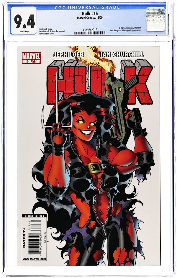 Cover by Ian Churchill. CODE RED: Part 3 of 4 - Written by JEPH LOEB. Art by IAN CHURCHILL. Rulk, Deadpool, Elektra, Punisher, and Thundra, vs. Wolverine and X-Force: Round 2! Plus, the 2nd appearance of the Red She-Hulk. Plus: a tale of the colorful Hulks by Audrey Loeb & Dario Brizuela. 32 pages, full color. Cover price $3.99. Grade: CGC 9.4 explanation of grade Condition: Used (collectible)
