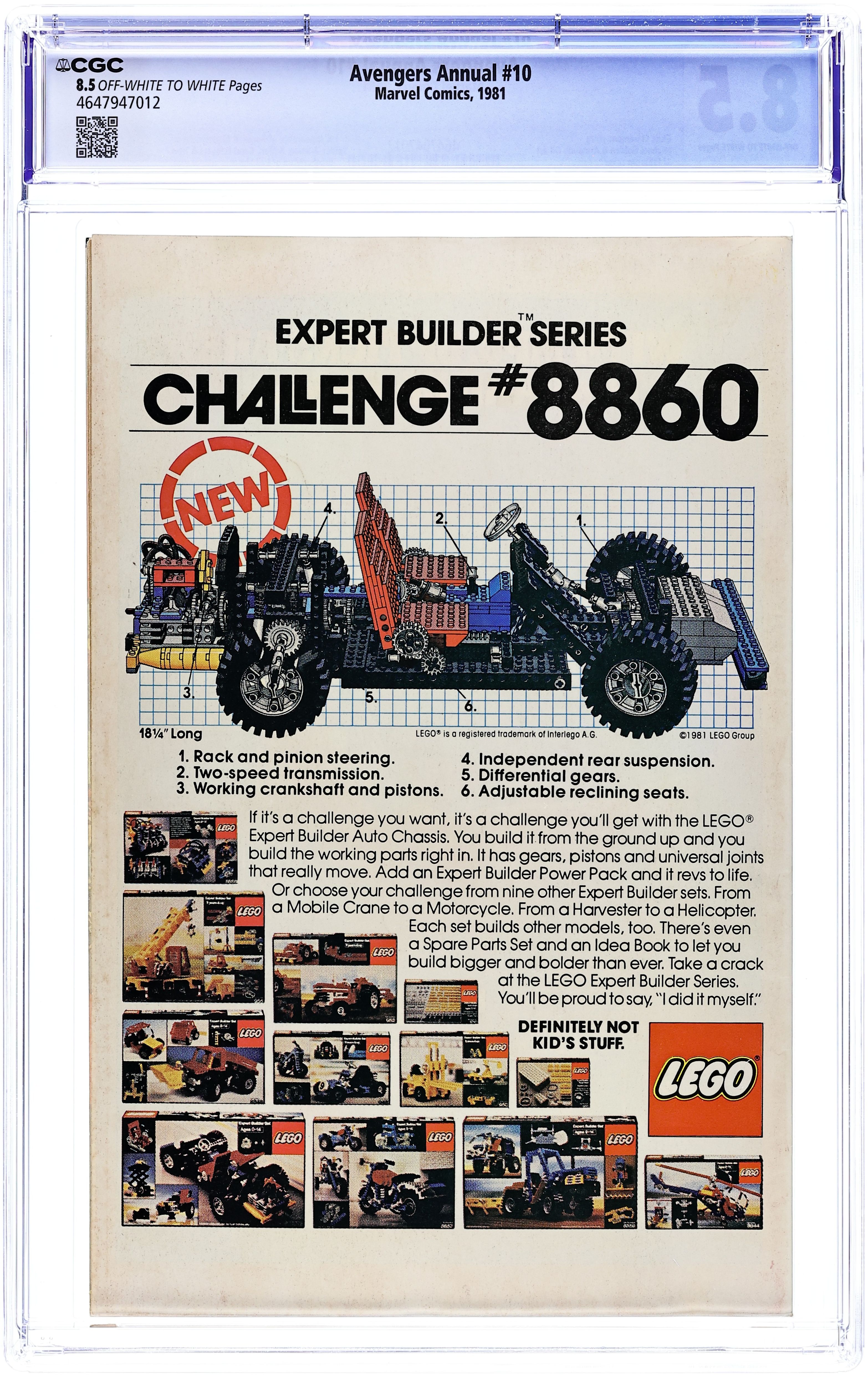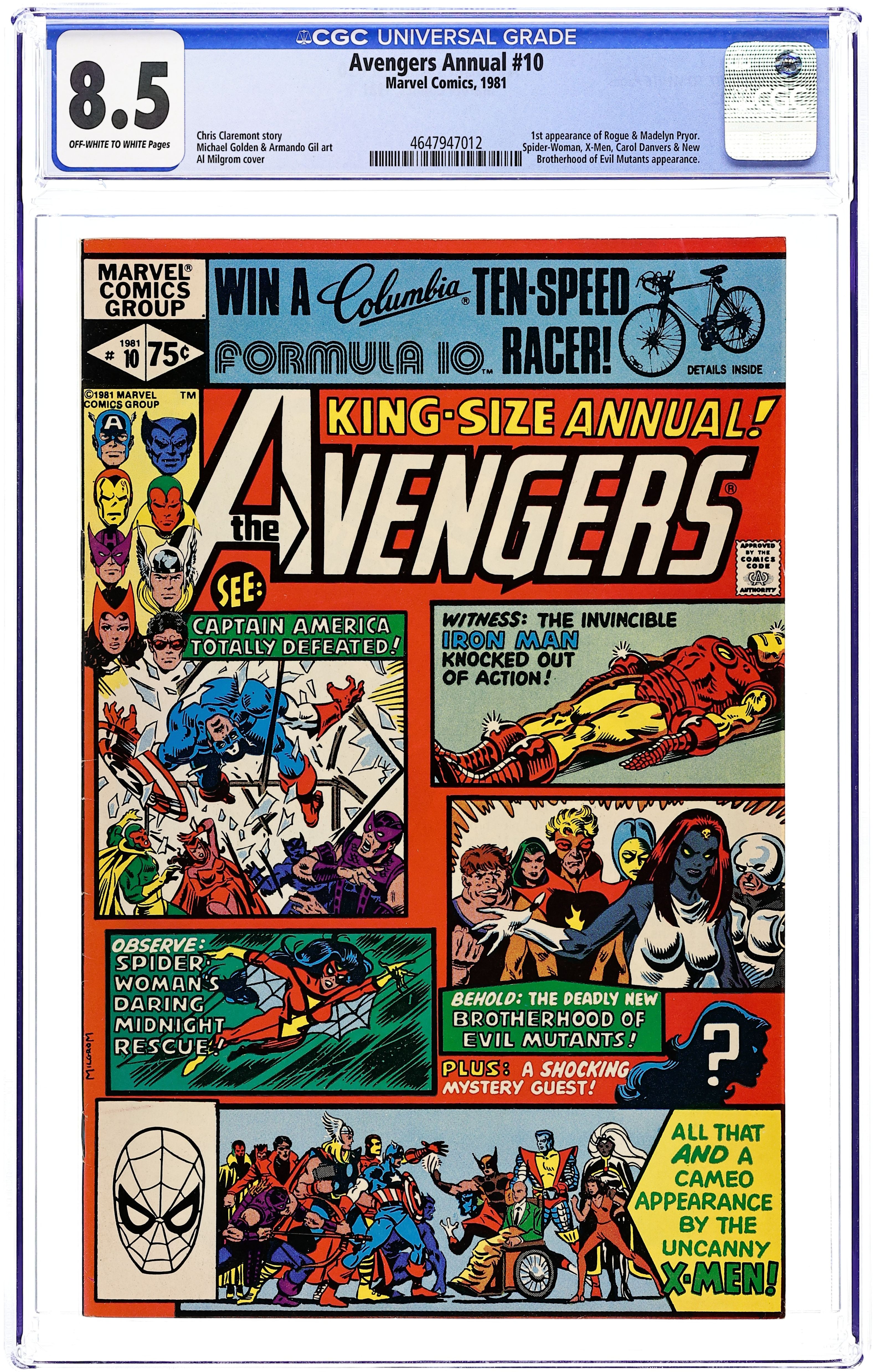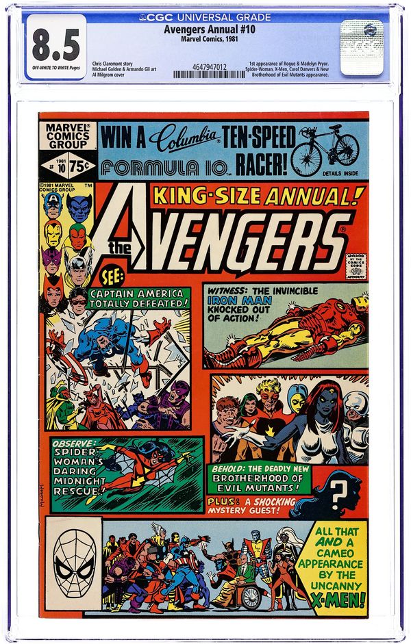 Direct Edition. First appearance of Rogue and Madelyne Pryor in "By My Friends Betrayed!" Spider-Woman, X-Men, Carol Danvers, and New Brotherhood of Mutants guest star. Script by Chris Claremont. Pencils by Michael Golden. Inks by Armando Gil. Cover by Al Milgrom. This action-packed annual has got it all, true believers: the first appearance of Rogue, the spectacular art of Michael Golden, the tragic return of Carol Danvers, and the stupendous struggle between the Brotherhood of Evil Mutants and the mighty Avengers! Following the events of Uncanny X-Men #142, Mystique & her New Brotherhood of Evil Mutants attempt to break four of their members out of Ryker's Island prison! After Rogue and Mystique take down Captain America, Iron Man, and Thor, the rest of the Avengers and Spider-Woman catch up to the villains, and the epic clash erupts! Woven in and around the frantic action at Ryker's Island is the heartbreaking story of Carol Danvers' return to Earth. Her life has fallen apart since leaving for Limbo with Marcus Immortus in Avengers #200, and now, stripped of her powers and memories, Carol begins the long road to recovery. And the first step is an emotional confrontation with her former teammates! Notes: Marvel Super-Heroes #11 (Fall 1992) fills in the details of Carol Danvers' life between Avengers #200 and Avengers Annual #10. The Thing stars in a one-page Hostess ad, "A Lesson to Be Learned!" This issue was reprinted in 1993 in the trade paperback: The Greatest Battles of the Avengers. 52 pages, full color. Cover price $0.75. Grade: CGC 8.5 explanation of grade Condition: Used (collectible)