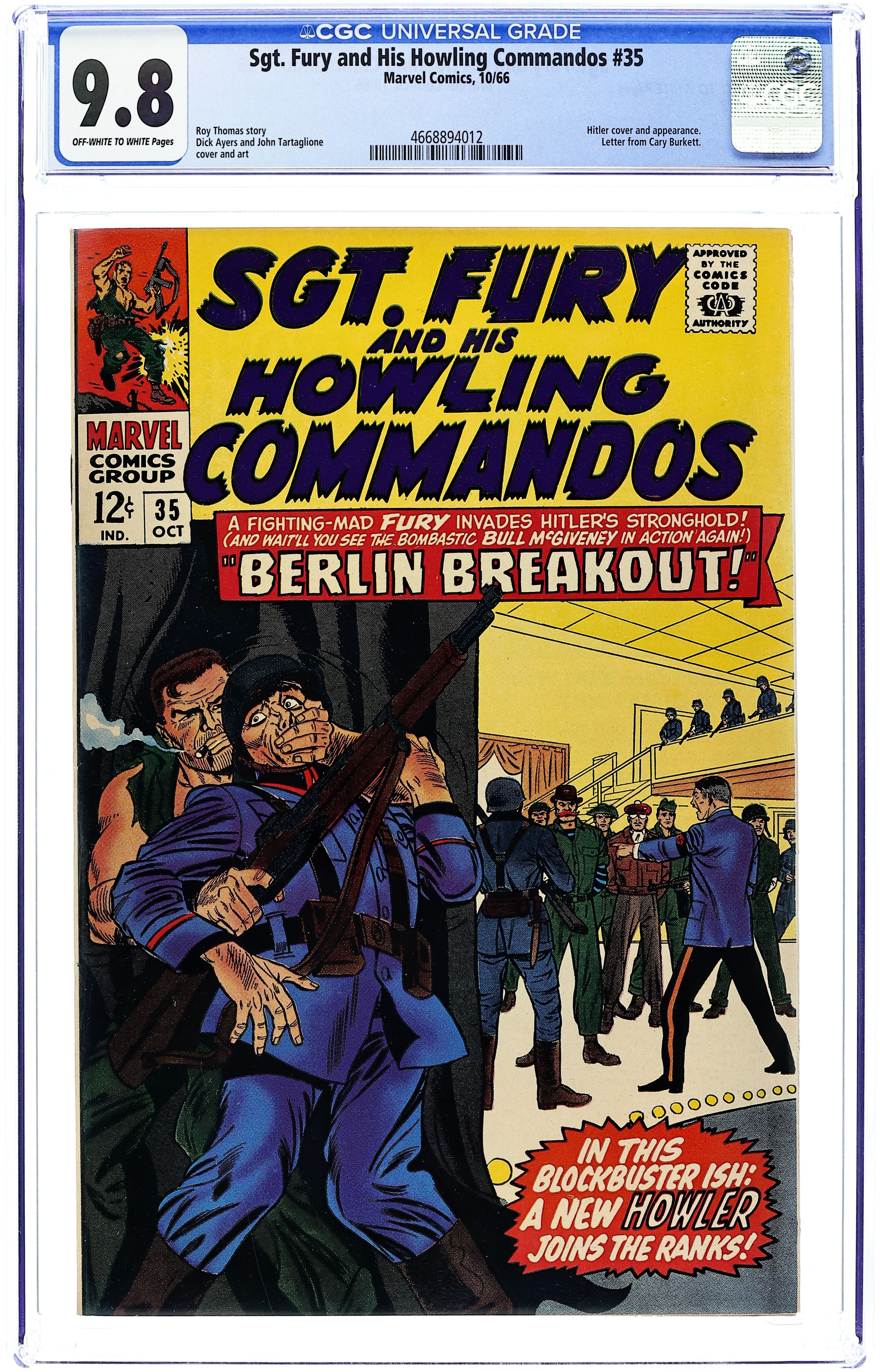 Cover pencils by Dick Ayers, inks by John Tartaglione. "Berlin Breakout!", script by Roy Thomas, pencils by Dick Ayers, inks by John Tartaglione; Captain Sawyer selects the members of the mission to rescue the Howlers, captured in Greece, who are bound for Berlin for a high-profile execution; Fury is given ex-Nazi Eric Koenig, Bull McGiveney, and his corporal, Rickets Johnson; They infiltrate the Berlin event with the help of Eric's sister, Ilsa, a double-agent working for the Nazis. They rescue the Howlers, but Dino Manelli is seriously wounded, and will not return to fight. Eric Koenig is named as his replacement. 36 pgs., full color. $0.12. Cover price $0.12. Grade: CGC 9.8 explanation of grade Condition: Used (collectible)