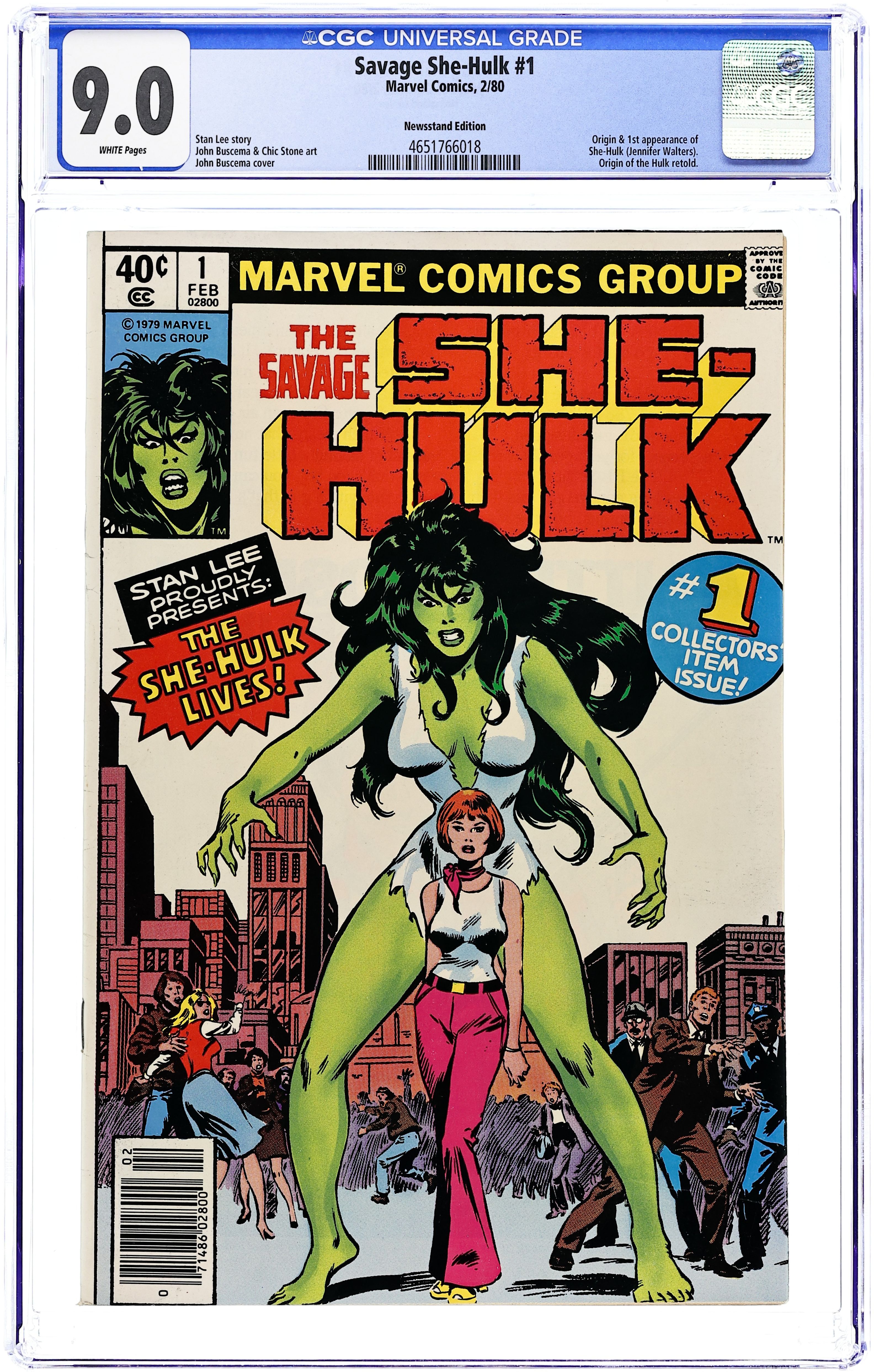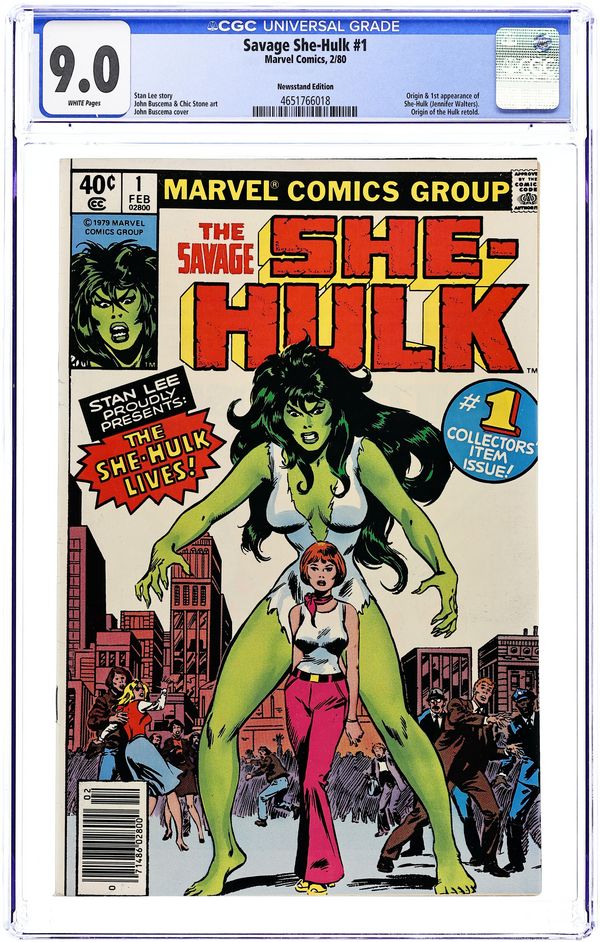 Newsstand Edition. 1st appearance and origin of the She Hulk. "The She-Hulk Lives!" Guest-starring Bruce Banner. Story by Stan Lee. Art by John Buscema and Chic Stone. Jennifer Walters is on the verge of death after an attempted assassination, and the only thing that will save her life is a blood transfusion from her cousin, Bruce Banner...AKA the Incredible Hulk! His gamma-irradiated blood sparks a startling transformation in his cousin, and she will forevermore be known as the Savage She-Hulk! Cover price $0.40. Grade: CGC 9.0 explanation of grade Condition: Used (collectible)