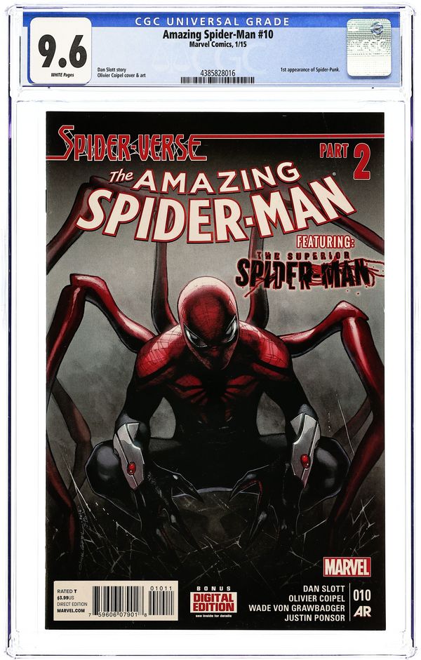 Spider-Verse: Part 2 of 6 - Written by Dan Slott. Art by Olivier Coipel and Wade Von Grawbadger. Cover by Olivier Coipel. SPIDER-VERSE PART 2! A spider-army is gathering to fight Morlun and his deadly family, but who will lead them? Why, only the greatest spider-hero of all, THE SUPERIOR SPIDER-MAN. Our universe's AMAZING SPIDER-MAN has an issue with that. GUEST STARRING- MILES MORALES! 28 pages, full color. Rated T Cover price $3.99. Grade: CGC 9.6 explanation of grade Condition: Used (collectible)