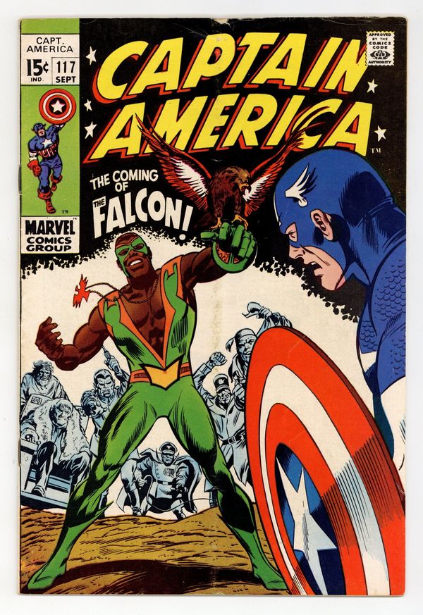 Cover pencils by Gene Colan and John Romita (alterations), inks by Joe Sinnott and John Romita (alterations). First appearance and origin of the Falcon in "The Coming of... the Falcon!", script by Stan Lee, pencils by Gene Colan, inks by Joe Sinnott; With the Red Skull previously having switched bodies with Captain America, the Skull uses the Cosmic Cube to send Cap to the tropical island home of the Exiles; There Cap encounters a falconer from Harlem who had been hired by the Exiles but who is now attempting to help the island natives kick the Exiles from their home; Cap joins forces with the falconer who, with Cap's urging, dons a costume and takes the name the Falcon. Letter to the editor from writer James Van Hise. 36 pgs., full color. $0.15. Cover price $0.15. Grade: GD/VG 3.0 explanation of grade Condition: Used (collectible)