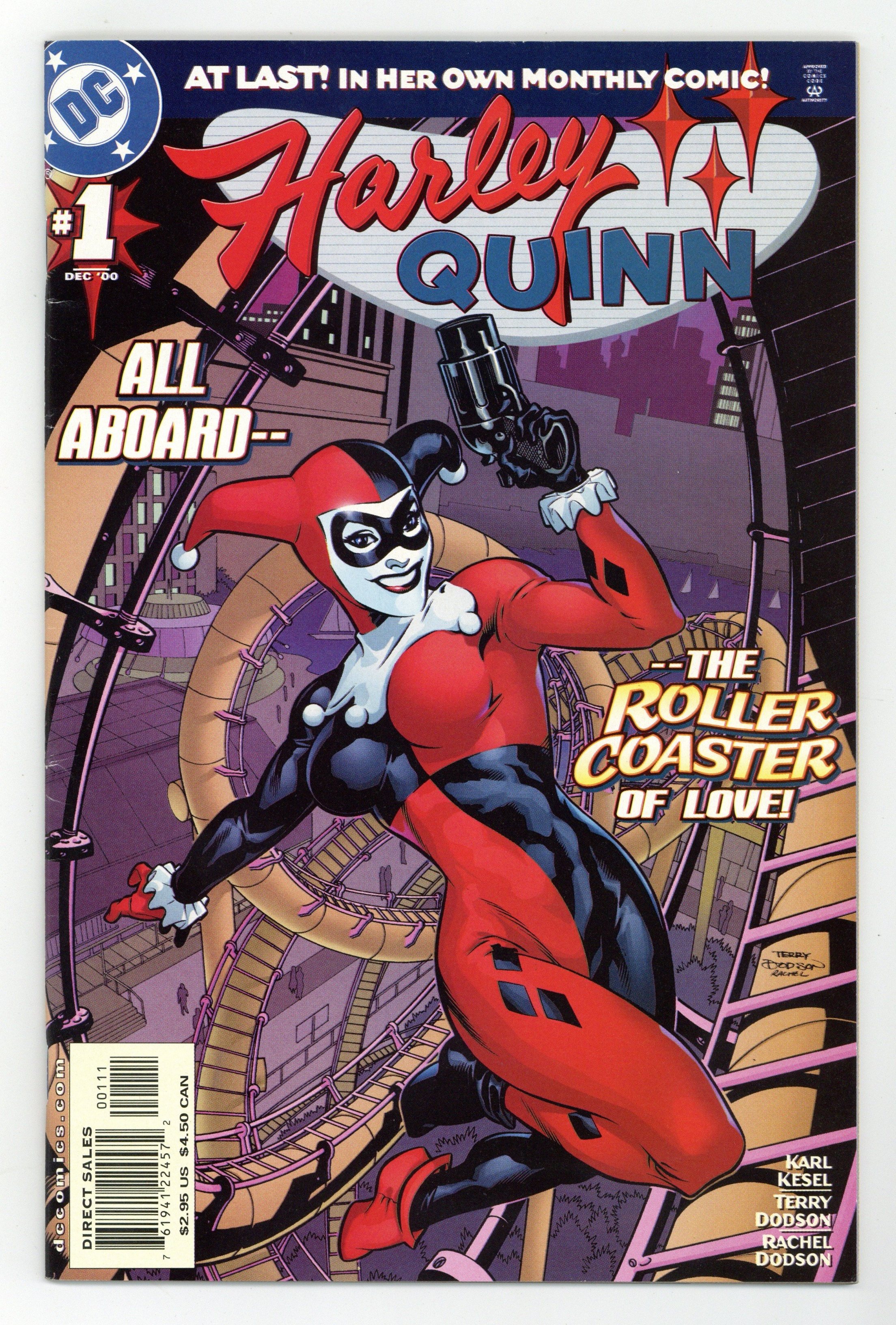 Starts Feb 23 From the moment she first appeared on Batman: The Animated Series, Harley Quinn has taken the world by storm. Now, building on her triumphant debut as part of the DC Universe during "No Man's Land" (in the hugely successful BATMAN: HARLEY QUINN one-shot), the Joker's special lady takes center stage in a new ongoing series titled ? what else? ? HARLEY QUINN. Written by Karl Kesel (SUPERBOY, Section Zero) with art and covers by Terry Dodson and Rachel Dodson (SILVER AGE, Generation X), HARLEY QUINN is not the story of an honorable woman and her quest for justice. Instead, it's a love story gone horribly, horribly, horribly wrong, especially in the first, extra-length issue, as the Joker's girlfriend must do without Mister J's "calming" influence! And considering just how many sandwiches short of a picnic Harley is, you know this book's going to be wild! Harley is driven to astounding lengths to free her loony lover. And that's just in the first seven pages! What follows is too strange for words, though it does involve one itsy-bitsy cameo by Batman. Just one! Once you see life through the eyes of Harley Quinn, you'll find she makes a lot more sense. Would you believe a little more sense? Cover price $2.95. Grade: FN 6.0 explanation of grade Condition: Used (collectible)