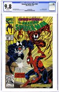 Starts Jul 4 First Printing. Direct Edition. "Savage Alliance!" Part 2 of 3. Guest-starring the Human Torch. Script by David Michelinie. Pencils by Mark Bagley. Inks by Randy Emberlin. Cover by Mark Bagley and Randy Emberlin. After getting a taste of Carnage's raw power last issue, the wall-crawler knows he needs serious help! To that end the amazing one does the unthinkable! He pays a visit to Venom! Wow, is that a good idea? However as a precaution the web-slinger brings Johnny Storm along for the ride to Venom's deserted island! And following an intense battle, Venom surprisingly agrees to help his good pal Spidey! So in a truly unlikely pairing, the Spectacular Spider-Man and the Lethal Protector join forces to take down Carnage! You have to see it to believe it! Cameo appearance by J. Jonah Jameson. (Note: The issue includes a full-page ad for the Toxic Crusaders (1992) series with art by Sam Kieth.) 36 pages. $1.25 cover price. Cover price $1.25. Grade: CGC 9.8 explanation of grade Condition: Used (collectible)
