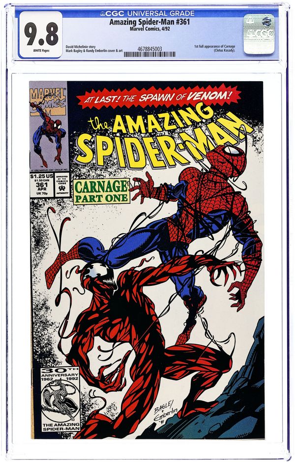 First Printing. Direct Edition. First (full) appearance of Carnage in "Savage Genesis!" Part 1 of 3. Script by David Michelinie. Pencils by Mark Bagley. Inks by Randy Emberlin. Cover by Mark Bagley and Randy Emberlin. Blood runs in the streets as a serial killer roams New York City! And as the web-slinger investigates the murders, he notices a very disturbing similarity to another killer's modus operandi! In a burned-out building in Brooklyn, the spectacular one comes face-to-face with his new homicidal foe...Carnage! Can the wall-crawler end Cletus Kasady's rampage in their very first encounter? Cameo appearances by Aunt May and Mary Jane Watson. Flashback cameo by Venom. (Note: This three-part story was reprinted in 2011 in the trade paperback: Spider-Man -- The Vengeance of Venom.) 36 pages, full color. $1.25 cover price. NOTE: Most of these were distributed with slight printer tears in the bottom edge of the cover. Cover price $1.25. Grade: CGC 9.8 explanation of grade Condition: Used (collectible)