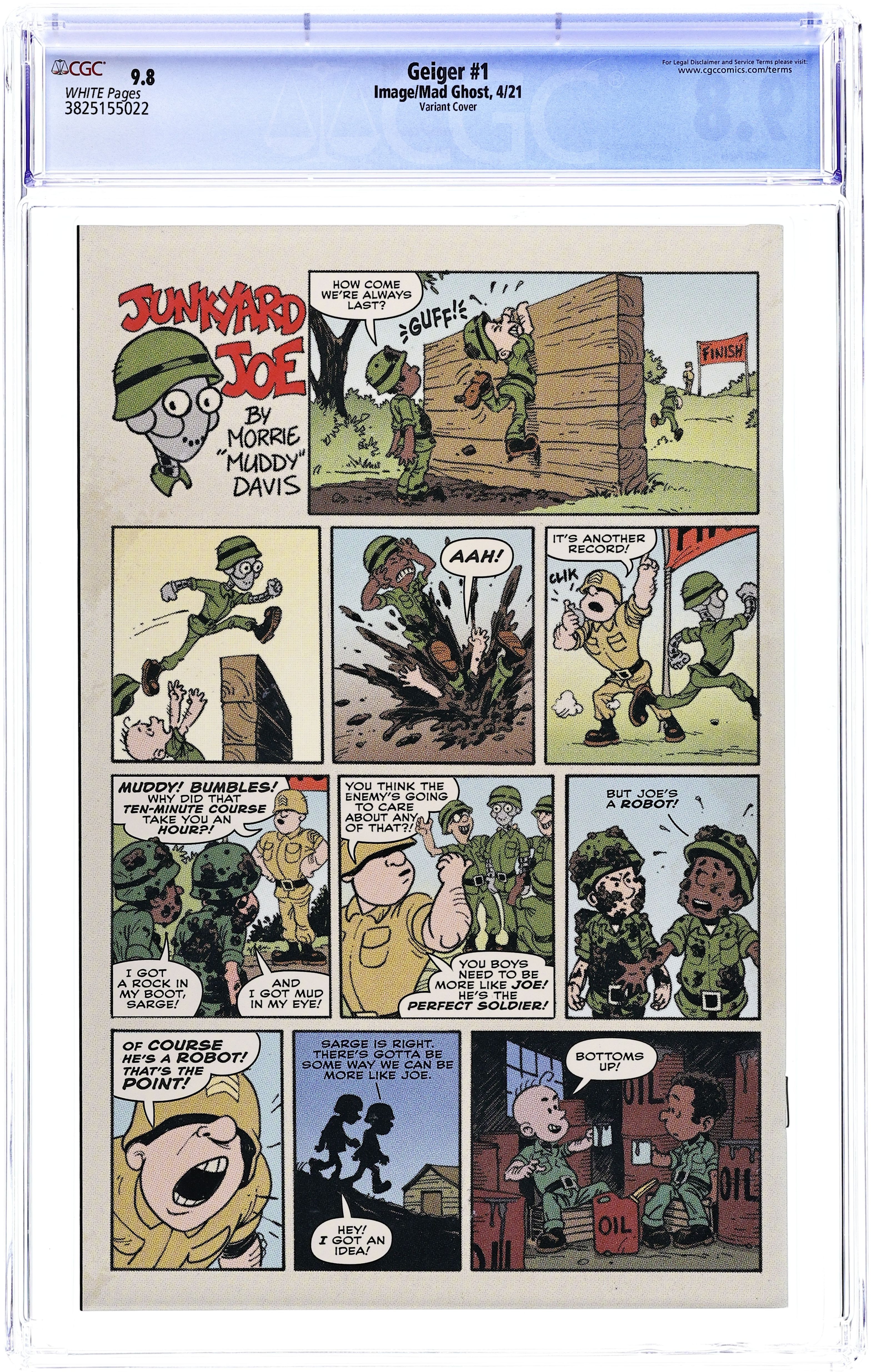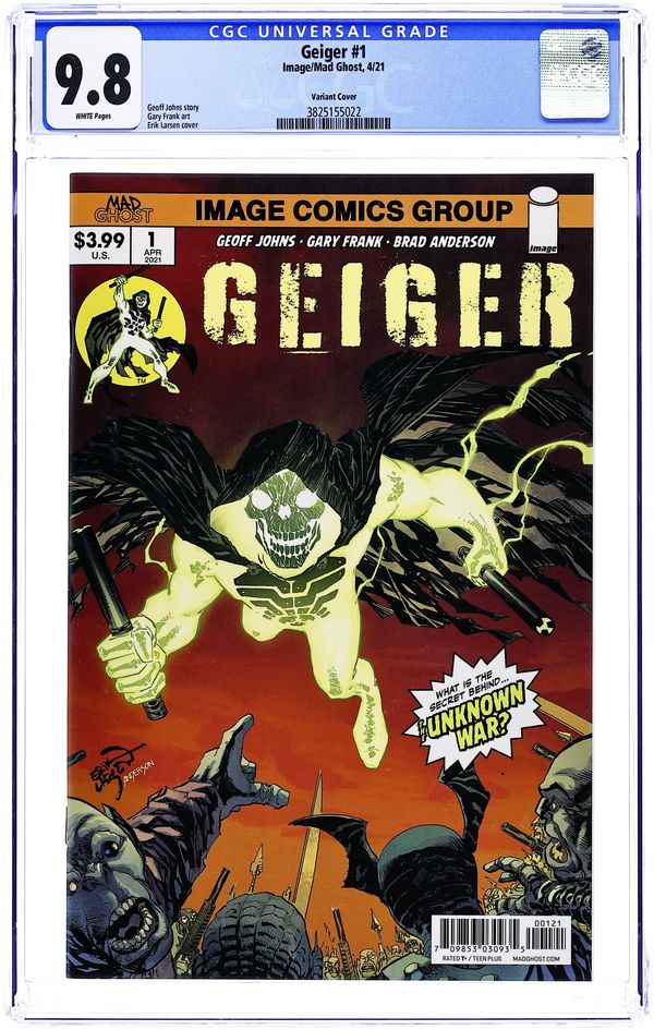 Starts Feb 16 Written by Geoff Johns. Art by Gary Frank. Cover by Erik Larsen. Industry heavyweights GEOFF JOHNS (Superman, Green Lantern, Batman: Three Jokers) and GARY FRANK (Superman, Supergirl, The Incredible Hulk) of DC's DOOMSDAY CLOCK reteam for what will be one of the most anticipated new series of 2021 in the forthcoming GEIGER. This mind blowing new series will take local comic shops by storm in April from Image Comics. Who are the scavengers of a dying earth? GEIGER is set in the years since a nuclear war ravaged the planet, desperate outlaws battle for survival in a world of radioactive chaos. Out past the poisoned wasteland lives a man even the Nightcrawlers and Organ People fear. Some name him Joe Glow, others call him The Meltdown Man. But his name⦠is Geiger. 32 pages, full color. Rated T+ Cover price $3.99. Grade: CGC 9.8 explanation of grade Condition: Used (collectible)