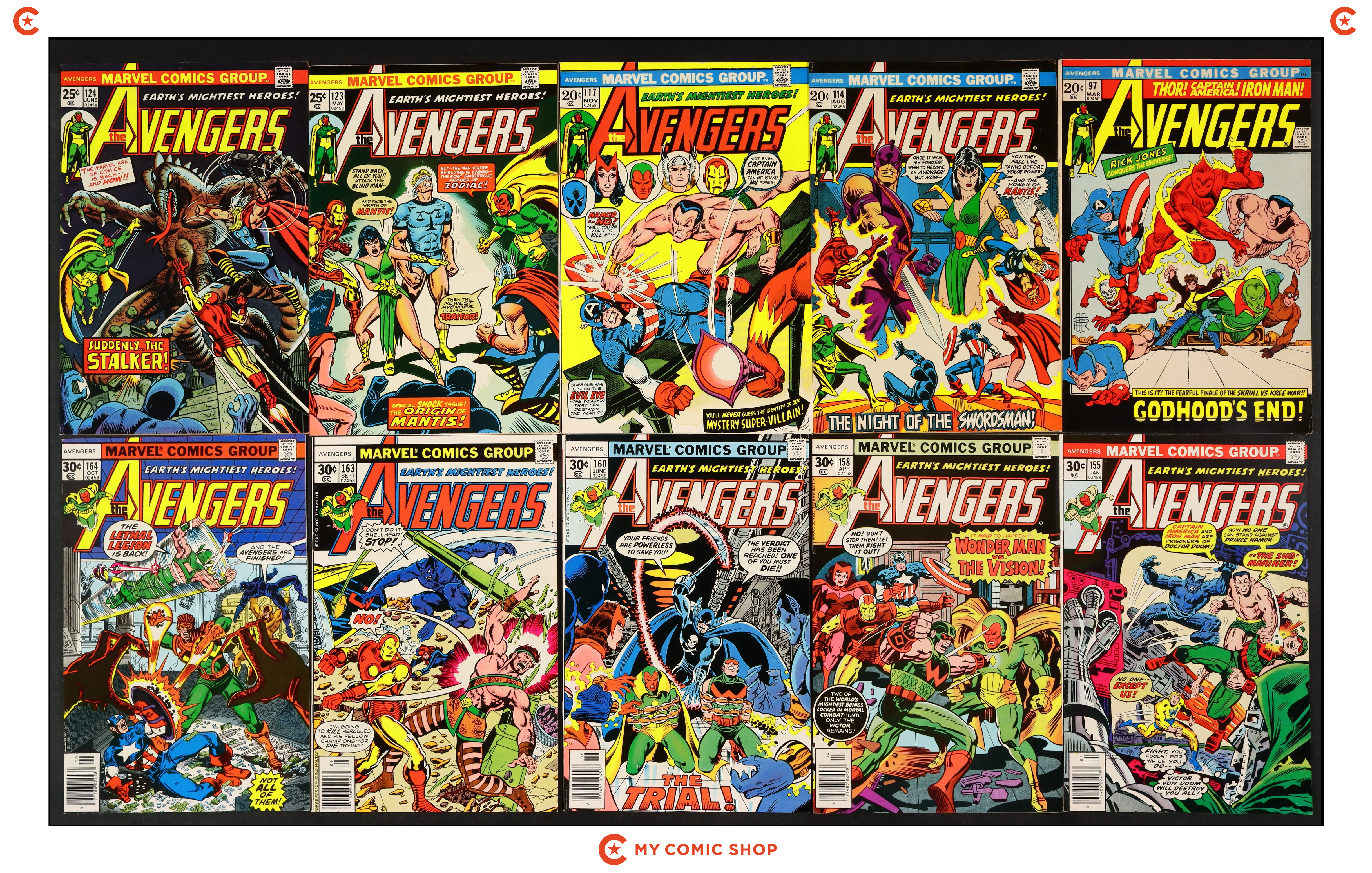 Issues 97, 114, 117, 123, 124, 155, 158, 160, 163, 164 of Avengers (1963 1st Series). Most will grade in the FN to VF range.