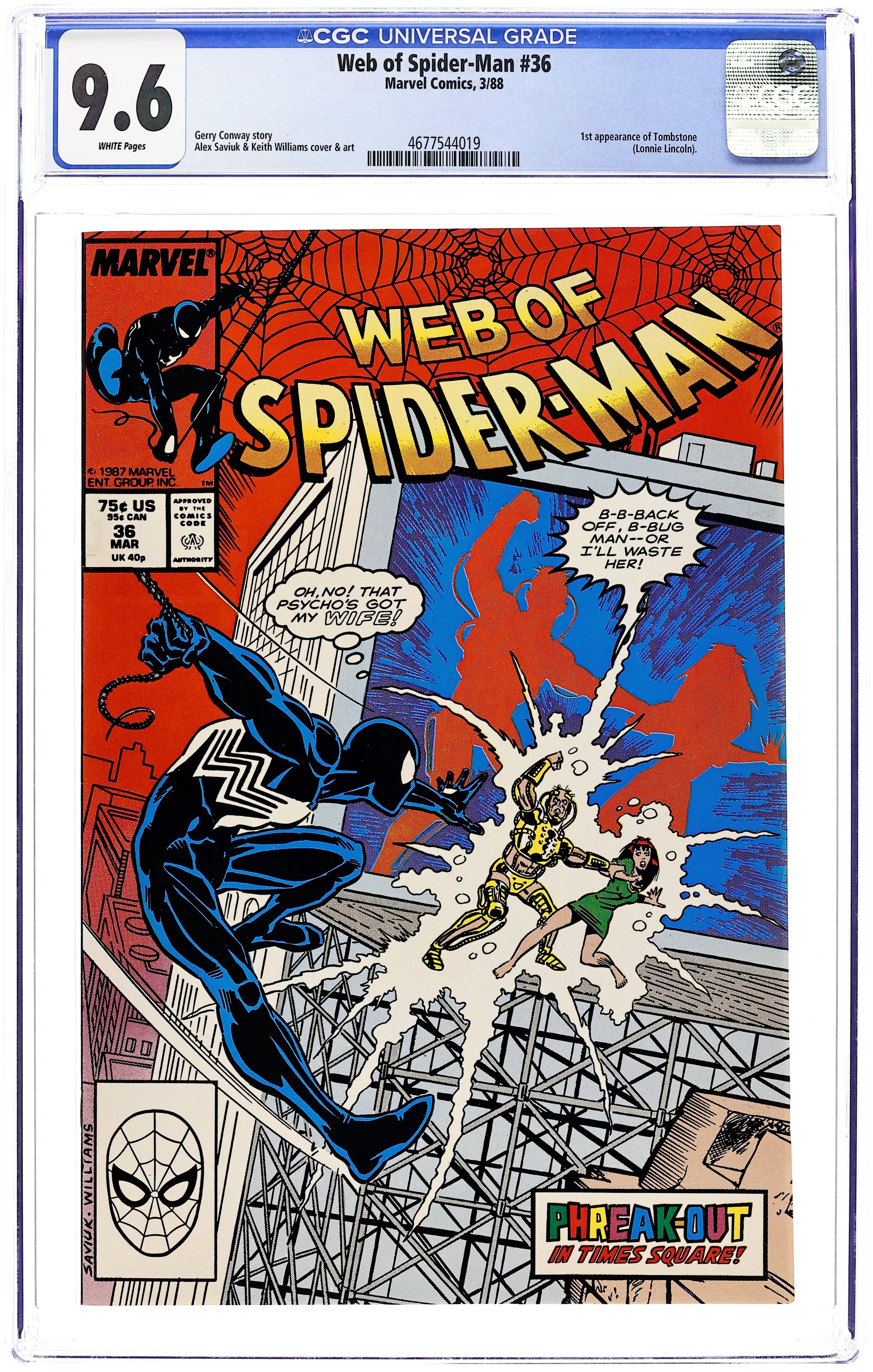 Direct Edition. "Phreak-Out!" Story by Gerry Conway. Art by Alex Saviuk and Keith Williams. The young scientist from the previous issue is still on the loose, and now he has built his own powerful exo-skeleton. The Phreak goes to Peter Parker's apartment and abducts Mary Jane; setting the stage for a showdown with Spider-Man over Times Square! Meanwhile, Joe Robertson is horrified to see a chilling old acquaintance and a soon-to-be new villain for Spider-Man. First appearance of Tombstone. 32 pages Cover price $0.75. Grade: CGC 9.6 explanation of grade Condition: Used (collectible)