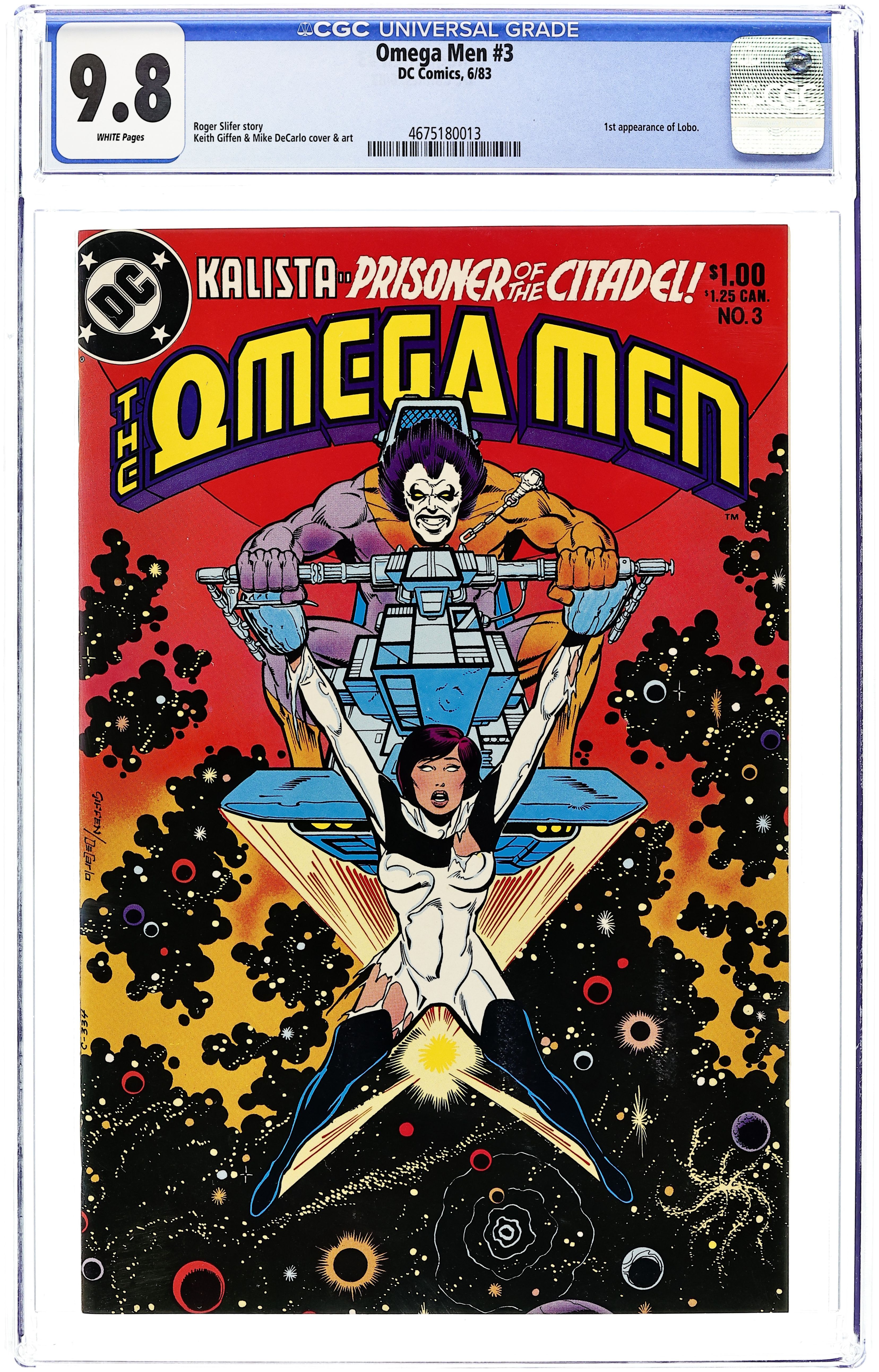 First appearance of Lobo. "Assault on Euphorix." Harry Hokum interrogates Kalista. The Omega Men try to keep the Citadel from taking over Euphorix. Chapter two of the Citadel War. Script by Roger Slifer, pencils by Keith Giffen, inks by Mike DeCarlo. Cover by Giffen and DeCarlo. Cover price $1.00. Grade: CGC 9.8 explanation of grade Condition: Used (collectible)