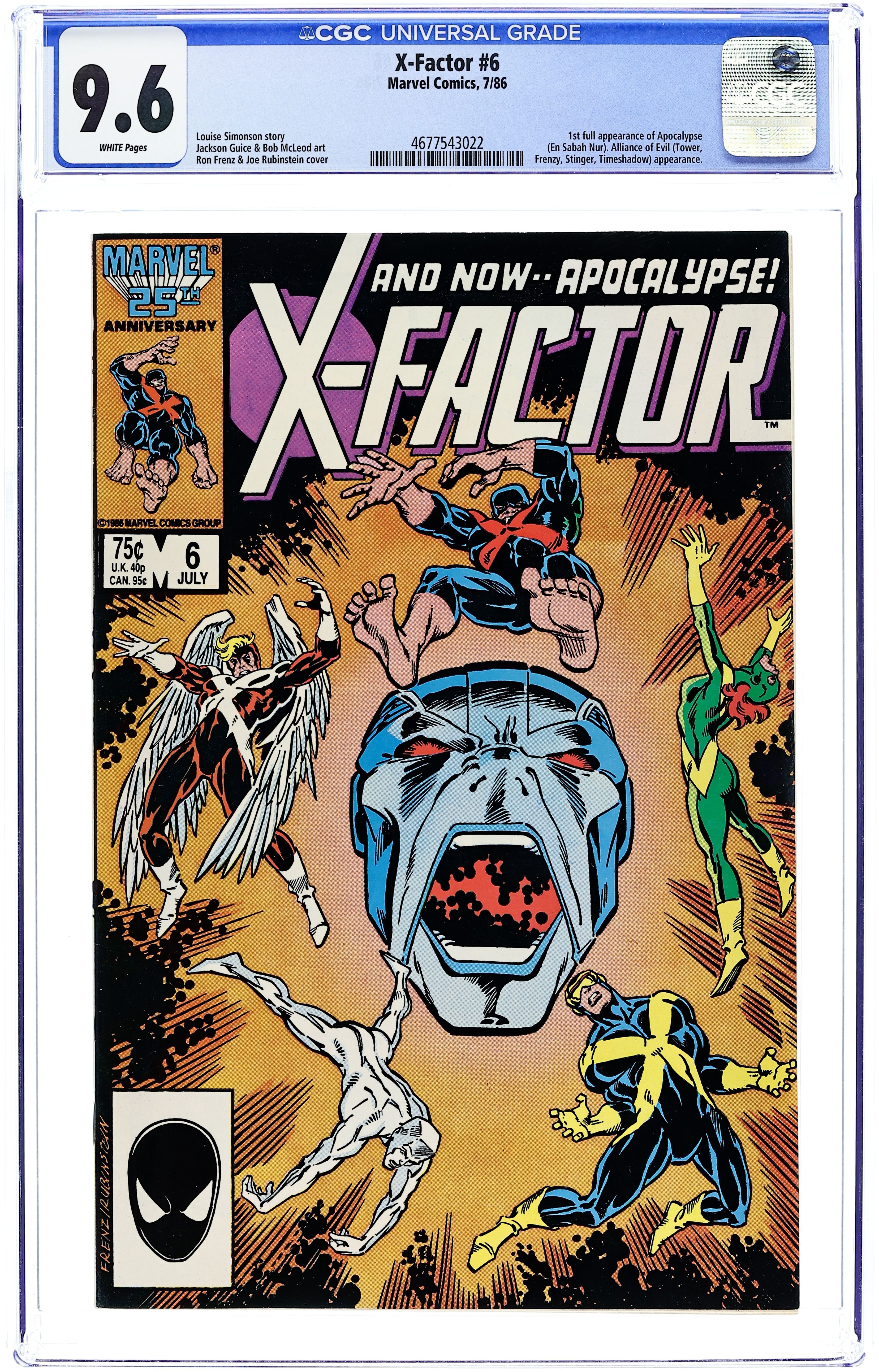Direct Edition. "Apocalypse Now!" Part 2 of 2. 1st full appearance of Apocalypse. Story by Louise Simonson. Art by Jackson Guice and Bob McLeod. Cover by Ron Frenz and Joe Rubinstein. Cyclops begins to worry that the group's X-Factor ads are fueling mutant paranoia among humans. Plus, the last time X-Factor fought the Alliance of Evil they were soundly defeated. Can they take down their adversaries in time to save the life of a fellow mutant, before it's too late? And, witness the fury and power of Apocalypse, a mutant tyrant who believes in a world where only the strong survive. Cover price $0.75. Grade: CGC 9.6 explanation of grade Condition: Used (collectible)