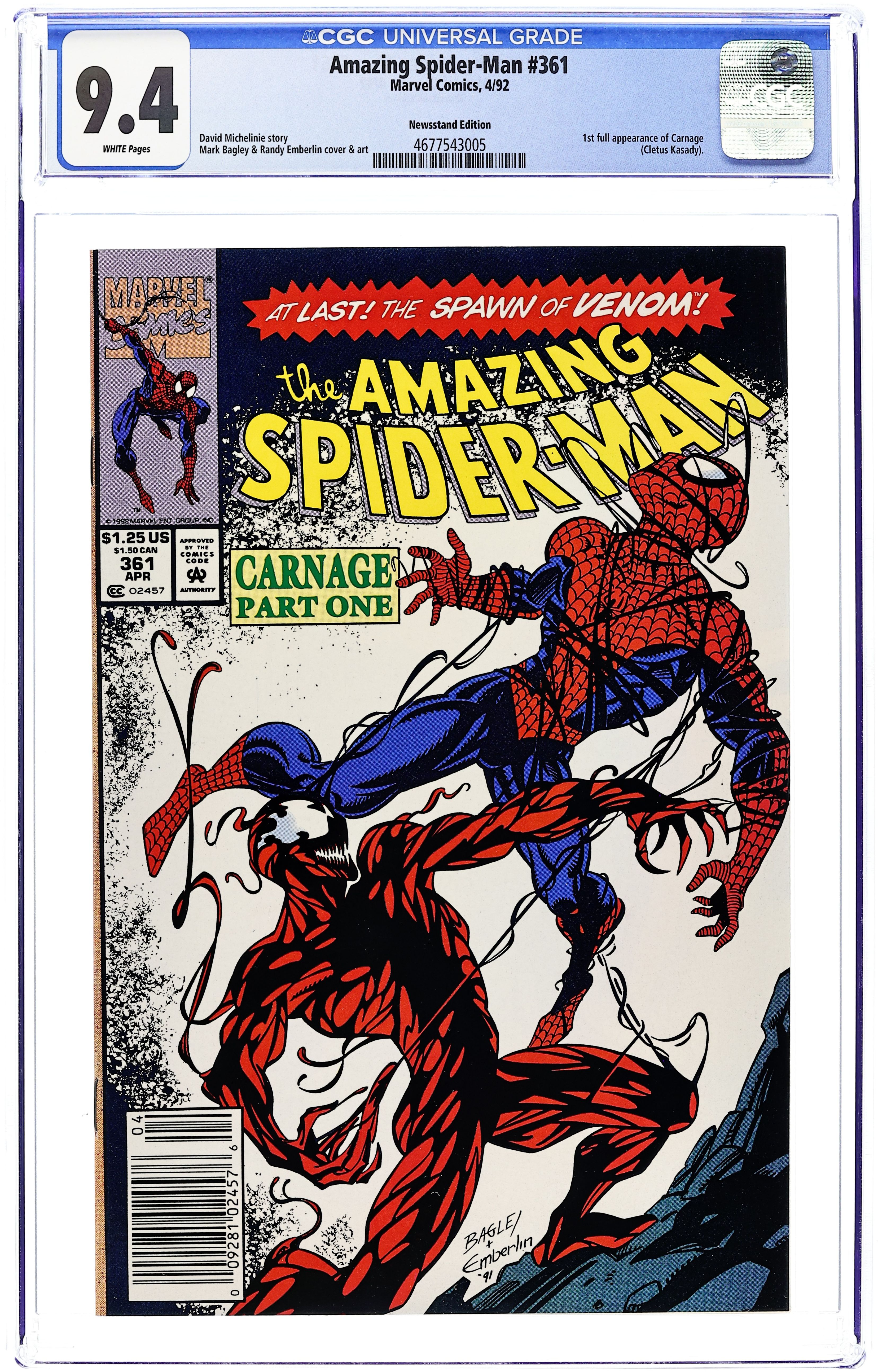 First Printing. Newsstand Edition. First (full) appearance of Carnage in "Savage Genesis!" Part 1 of 3. Script by David Michelinie. Pencils by Mark Bagley. Inks by Randy Emberlin. Cover by Mark Bagley and Randy Emberlin. Blood runs in the streets as a serial killer roams New York City! And as the web-slinger investigates the murders, he notices a very disturbing similarity to another killer's modus operandi! In a burned-out building in Brooklyn, the spectacular one comes face-to-face with his new homicidal foe...Carnage! Can the wall-crawler end Cletus Kasady's rampage in their very first encounter? Cameo appearances by Aunt May and Mary Jane Watson. Flashback cameo by Venom. (Note: This three-part story was reprinted in 2011 in the trade paperback: Spider-Man -- The Vengeance of Venom.) 36 pages, full color. $1.25 cover price. NOTE: Most of these were distributed with slight printer tears in the bottom edge of the cover. Cover price $1.25. Grade: CGC 9.4 explanation of grade Condition: Used (collectible)
