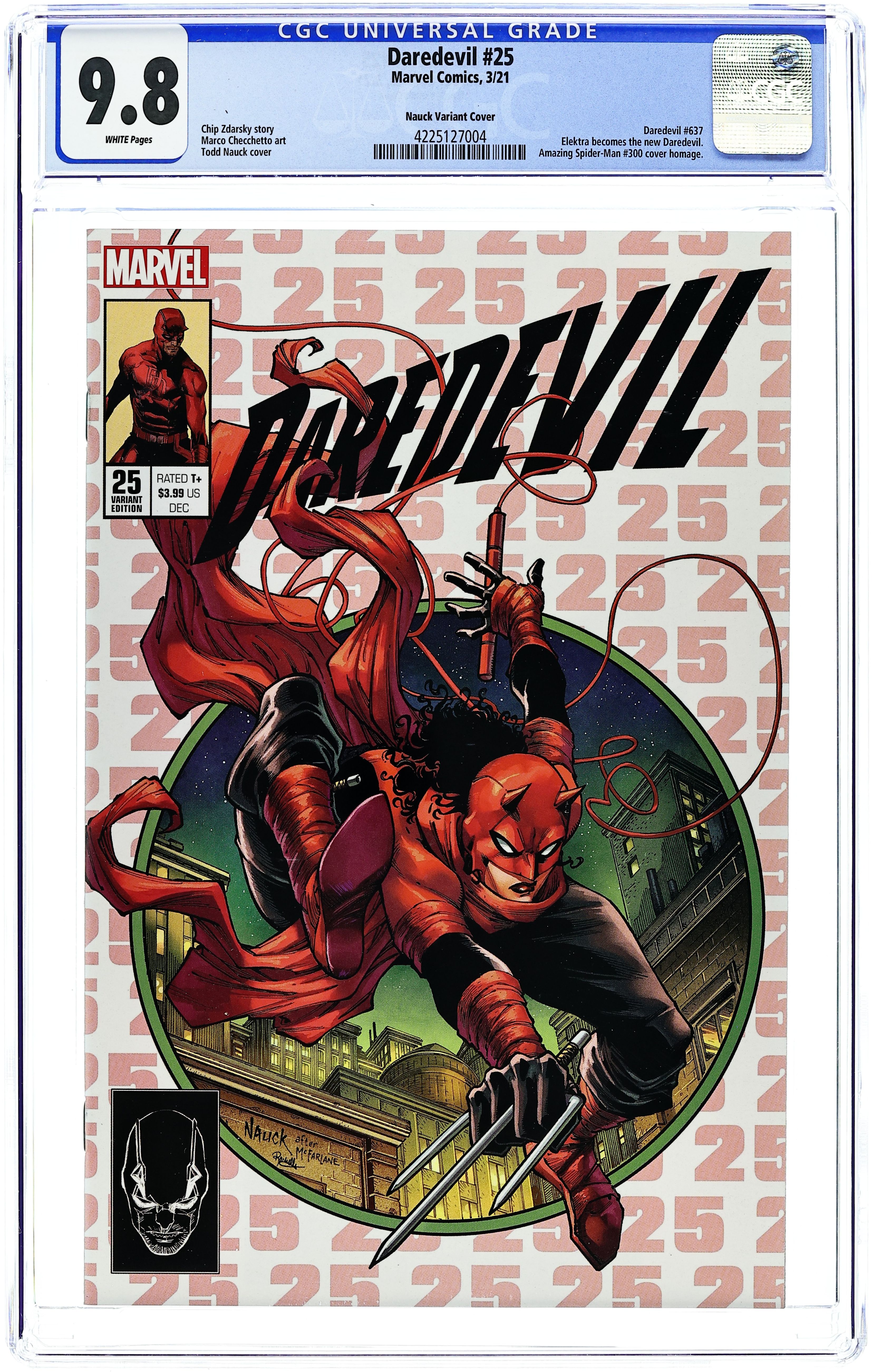 Second Printing Homage Variant Cover by Todd Nauck. Homage to Amazing Spider-man #300 cover. Written by Chip Zdarsky. Art by Marco Checchetto. 'DOING TIME' Starts Here! After a landmark year that put Daredevil through the wringer, this December, CHIP ZDARSKY and MARCO CHECCHETTO are dropping the Man Without Fear into familiar territory: behind bars. But there are no conspiracies against Daredevil to be found here - just the truth that his actions led to a man's death. Faced with the reality and consequences of his actions, will Daredevil have the stomach to serve his term? Worse still, facing down a prison's worth of criminals he helped put away, will he survive it? 28 pages, full color. Rated T+ Cover price $3.99. Grade: CGC 9.8 explanation of grade Condition: Used (collectible)