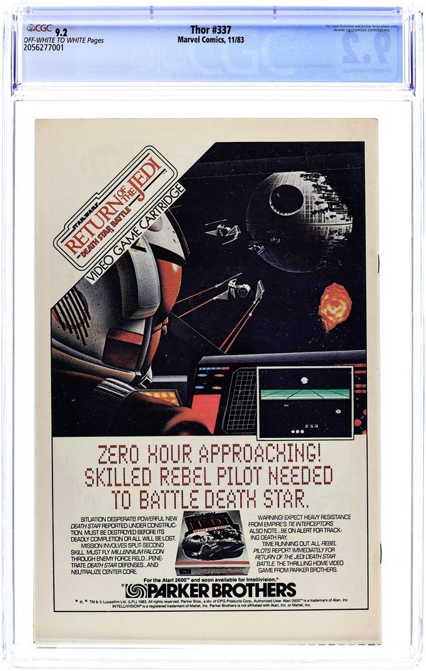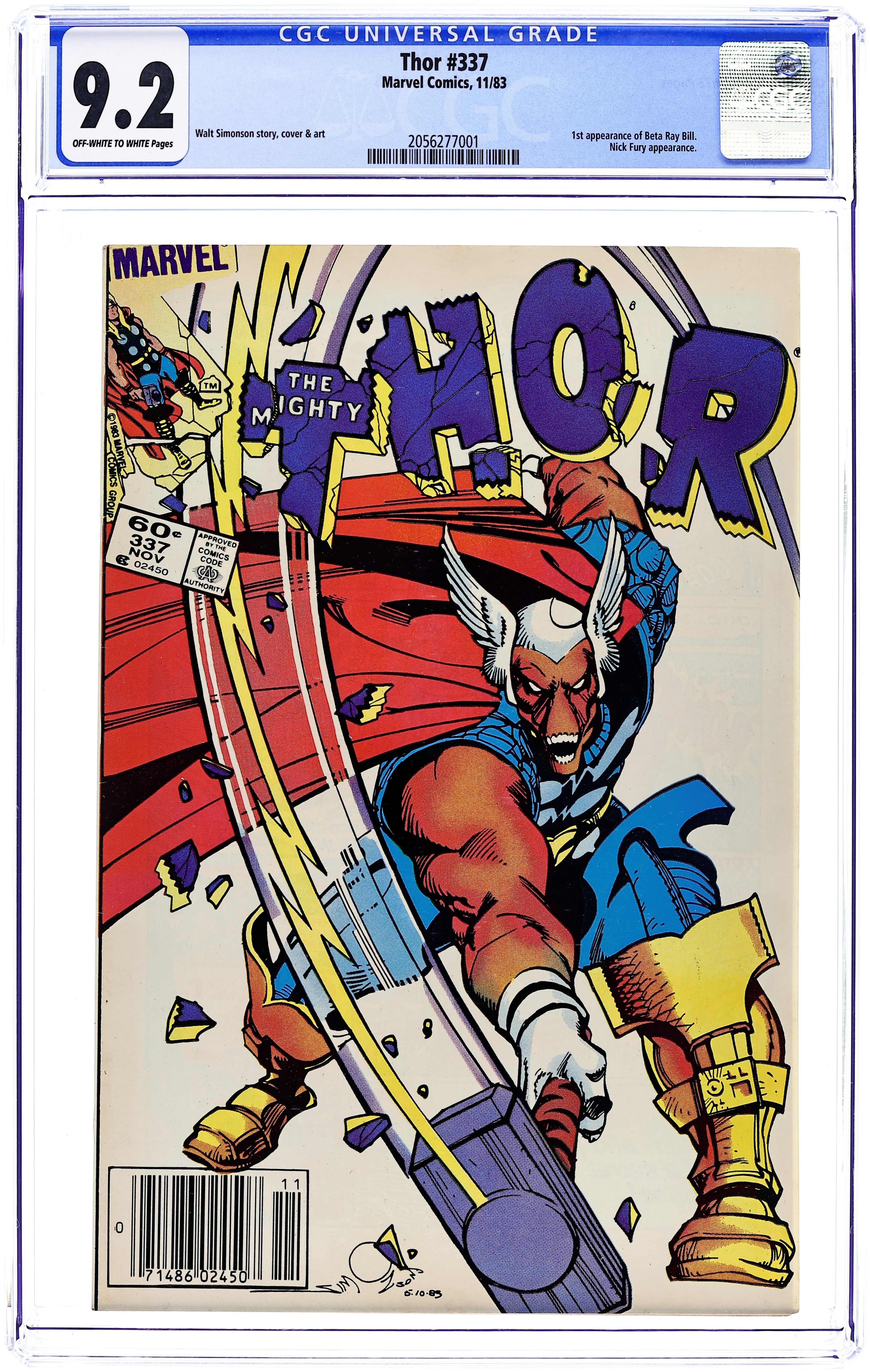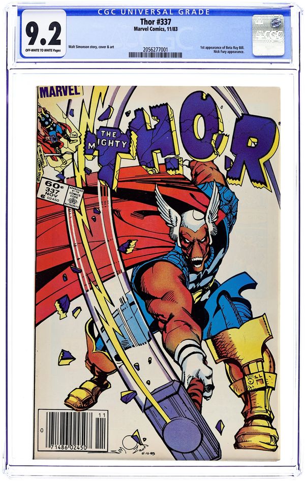 Starts Feb 16 Newsstand Edition. Cover by Walt Simonson. Beta Ray Bill (first appearance) becomes Thor in "Doom!", script and art by Walt Simonson; Nick Fury asks Thor's aid in investigating an alien ship heading for earth; Thor arrives and triggers the awakening of an alien protector, Beta Ray Bill; Bill bests Thor and takes up his hammer only to be accidentally summoned to Asgard by Odin who thinks he is summoning Thor. Brief appearances by Nick Fury, Loki, Sif, Balder, Heimdall, Volstagg, and Odin. First appearance of Lorelei (sister of the Enchantress). Begins Walt Simonson's run on Thor (through #382). Bullpen Bulletins. Star Frontiers TSR ad. 36 pgs., full color. $0.60. Cover price $0.60. Grade: CGC 9.2 explanation of grade Condition: Used (collectible)