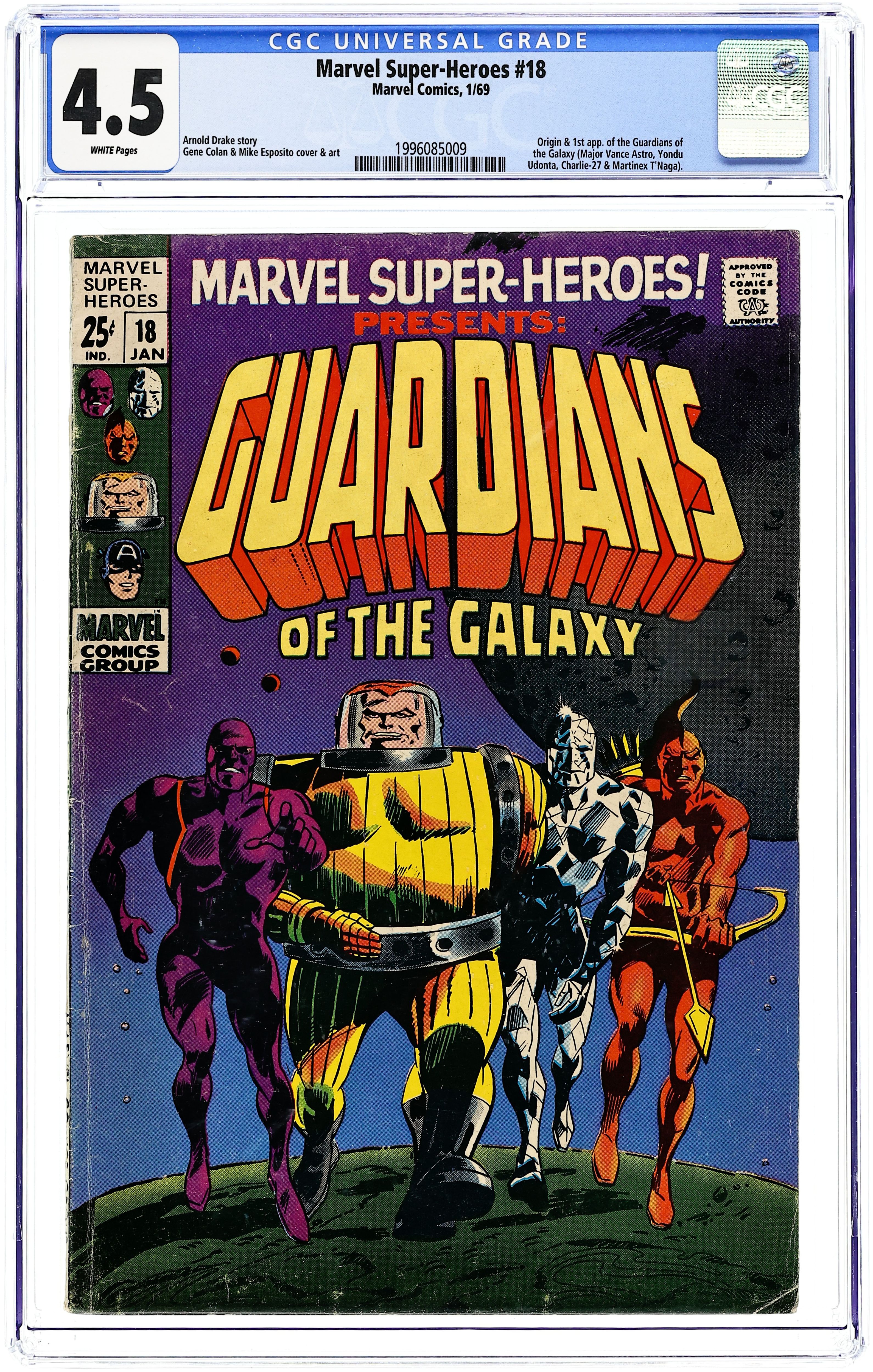 Starts Apr 4 Giant-size issue. Origin and 1st appearance of the Guardians of the Galaxy. Script by Arnold Drake, pencils by Gene Colan, inks by Mike Esposito (as Mickey Demeo). The remainder of the issue contains Golden Age reprints: the Sub-Mariner ("Courage"); and the All Winners Squad featuring Miss America, the Human Torch, and Captain America (from All Winners 21). Letter to the editor from comics writer Steven Grant. Colan cover pencils. Cover price $0.25. Grade: CGC 4.5 explanation of grade Condition: Used (collectible)