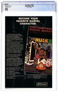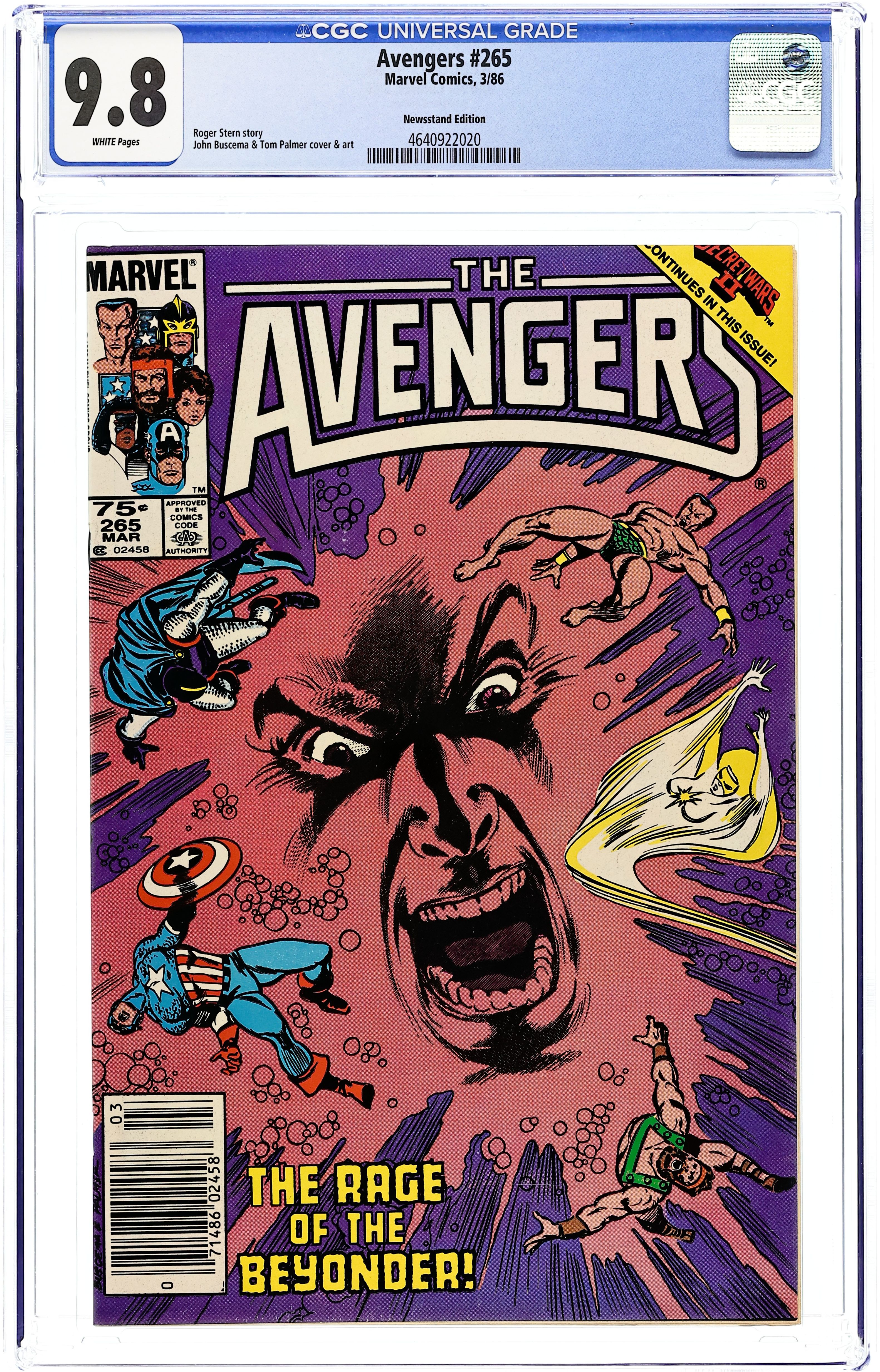 Newsstand Edition. "Eve of Destruction" Secret Wars II tie-in. Script by Roger Stern. Art by John Buscema (breakdowns) and Tom Palmer (finishes). Cover by John Buscema and Tom Palmer. Story continues from Secret Wars II Limited Series issue 8. The Beyonder has captured Captain America and spun up a tornado to trap the remaining avengers! But the mighty Prince of Power blows away the twister and saves his teammates! After getting reorganized Captain Marvel leads Hercules, the Black Knight, and the Sub-Mariner to the Colorado Rockies to rescue the star-spangled avenger! But the Beyonder is enraged! And beyond reasoning, beyond understanding, and perhaps beyond humanity. Will the universe survive, much less the Avengers? Story continues in Secret Wars II Limited Series issue 9. 36 pgs. Cover price $0.75. Grade: CGC 9.8 explanation of grade Condition: Used (collectible)