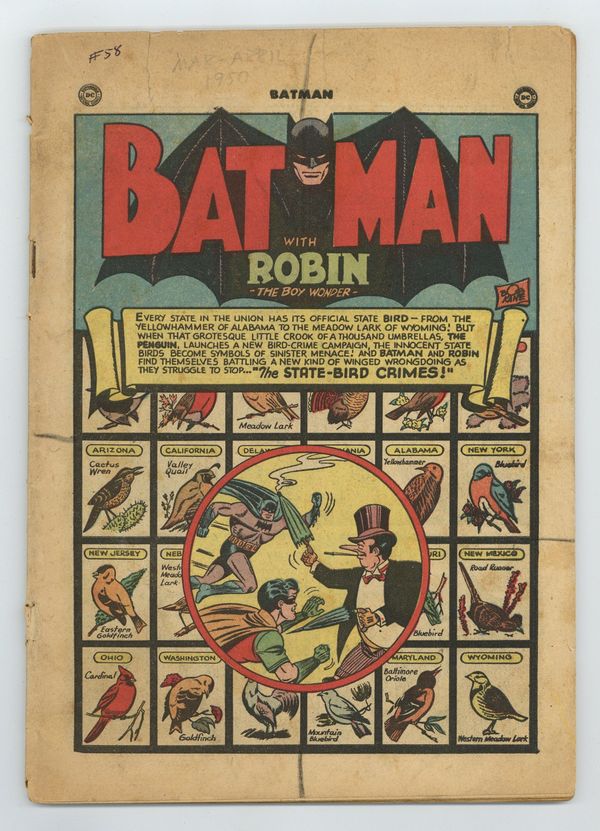 Cover pencils by Dick Sprang, inks by Charles Paris. The State-Bird Crimes!, script by Bill Woolfolk, pencils by Dick Sprang, inks by Charles Paris; While paroled from prison, the Penguin tries to convince the Birdlovers' Society to elect the Penguin as state bird; They mock him so he robs them one by one until Batman and Robin intervene. The Brand of a Hero!, script by Bill Finger, pencils by Dick Sprang, inks by Charles Paris; Bruce Wayne and Dick Grayson discover an unsolved mystery from the past; Professor Carter Nichols sends them back in time to investigate. Death Dance, art by Jack Sparling. One-page Daffy & Doodle story. Ultraviolet Bullets text article, art by Raymond Perry. The Black Diamond!, pencils by Bob Kane (Batman and Robin figures only) and Lew Sayre Schwartz, inks by Charles Paris; Crime lord The Black Diamond helps notorious criminals escape from prison so they will join his gang; He tells his gang to kill Batman; They manage to shoot him. -page Little Pete story by Henry Boltinoff. Superman's Code for Buddies public service announcement, script by Jack Schiff, art by Al Plastino. 52 Pages, Full Color. Cover price $0.10. Grade: Coverless explanation of grade Condition: Used (collectible)