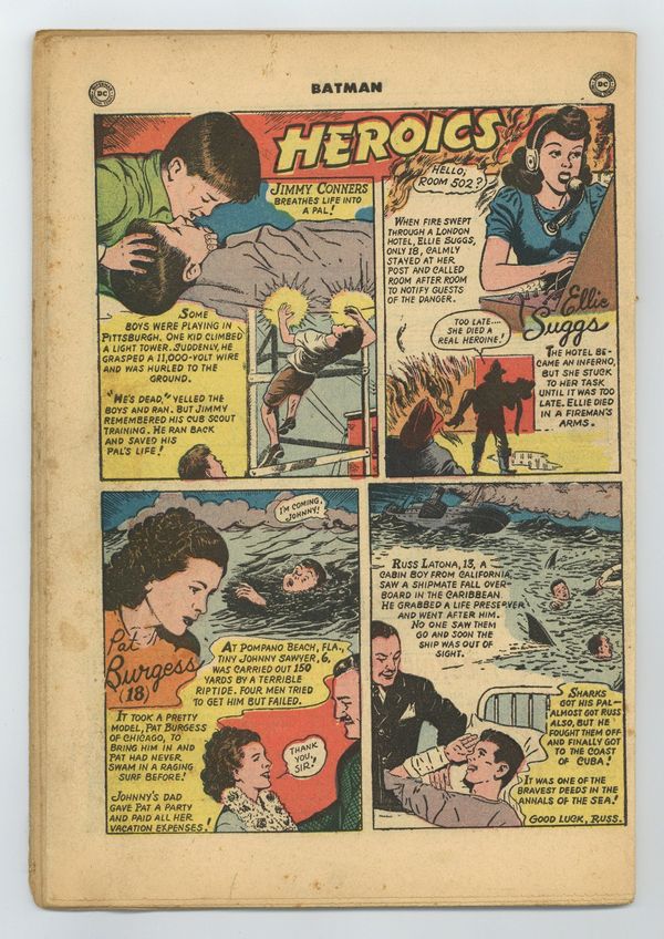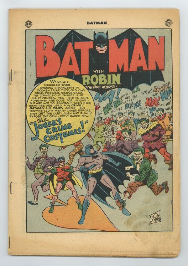 Cover pencils by Bob Kane (Batman and Robin figures only) and Lew Sayre Schwartz, inks by Charles Paris. "The Joker's Crime Costumes!", script by Bill Finger, pencils by Dick Sprang, inks by Charles Paris; Inspired by Batmans arsenal of Batsuits, the Joker begins a new crime spree with different costumes. "The Case of the Flying Saucers," pencils by Bob Kane (Batman and Robin figures only) and Lew Sayre Schwartz, inks by Charles Paris; When the death of a mysterious person reaches the Gotham City Police Department, Commissioner Gordon calls Batman and Robin; The clues indicate that the dead person is an alien from Saturn. Jerry the Jitterbug two-page story by Henry Boltinoff. -page Little Pete story by Henry Boltinoff. "The Origin of Killer Moth!", pencils by Bob Kane (Batman and Robin figures only) and Lew Sayre Schwartz, inks by Charles Paris; Prisoner #234026 reads a newspaper article about Batman and decides to set himself up as the "anti-Batman," hiring himself out to Gotham City's criminals to help them elude capture by Police; When released, he establishes a false identity as millionaire philanthropist and becomes friends with Bruce Wayne. -page Peg story by Henry Boltinoff. The World of Adventure in Books public service announcement starring Green Arrow, Tomahawk, and Shining Knight, script by Jack Schiff, art by Win Mortimer. One-page Tootsie Roll ad, "Captain Tootsie Cheers Orphans" by Bill Schreiber. 52 Pages, Full Color. Cover price $0.10. Grade: Coverless explanation of grade Condition: Used (collectible)