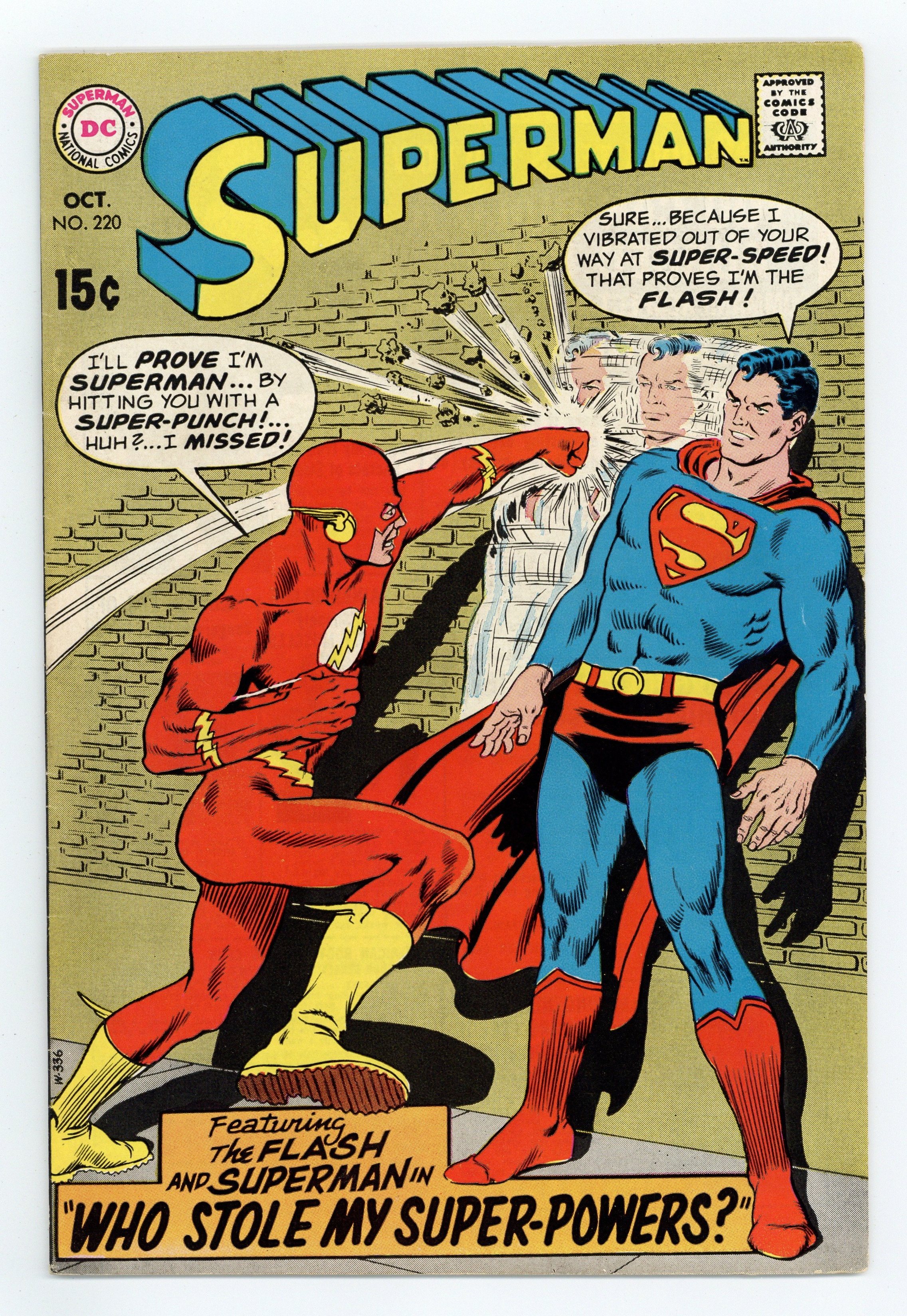Ends Feb 23 9:26 PM CST Bid History 2 bids Current Bid $8 Your Secret Max Bid If you'd like to bid, please log in or register. Cover pencils by Curt Swan, inks by Murphy Anderson. Who Stole My Super-Powers? starring Superman, pencils by Curt Swan, inks by George Roussos; Superman and the Flash, victims of amnesia, have inadvertently switched identities. 36 Pages, Full Color. Cover price $0.15. Grade: FN- 5.5 explanation of grade Condition: Used (collectible)