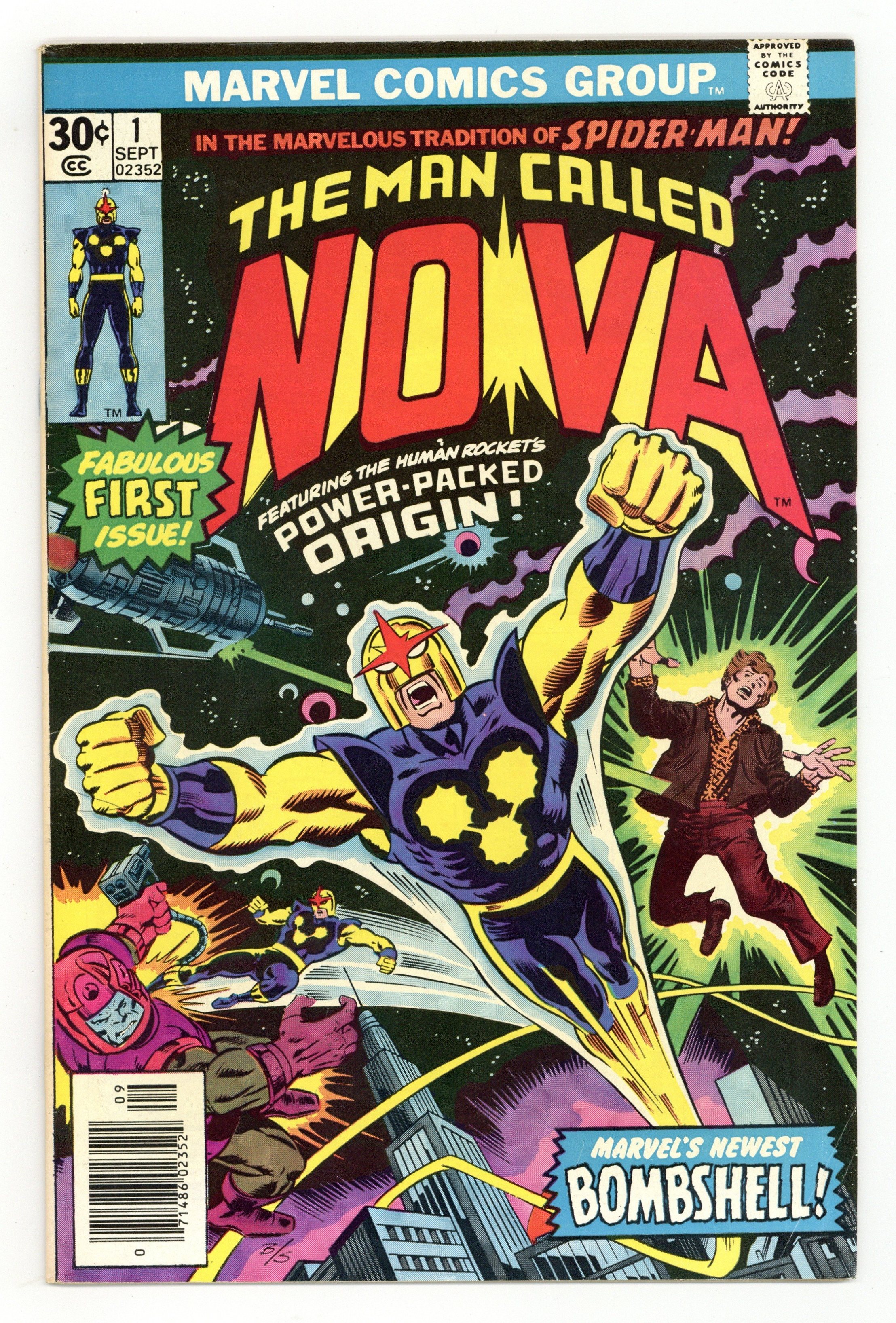 Starts Feb 23 Written by Marv Wolfman. Pencils by John Buscema. Inks Joe Sinnott. When a dying alien passes on his super-powers to Earth teenager Richard Rider, Rider becomes the man called Nova, the human rocket! In the marvelous tradition of Spider-man, Nova must now stop the murderous alien known as Zorr, or Earth is doomed! Note: First appearance of Nova. 36 pages, full color. Cover price $0.30. Grade: VG+ 4.5 explanation of grade Condition: Used (collectible)