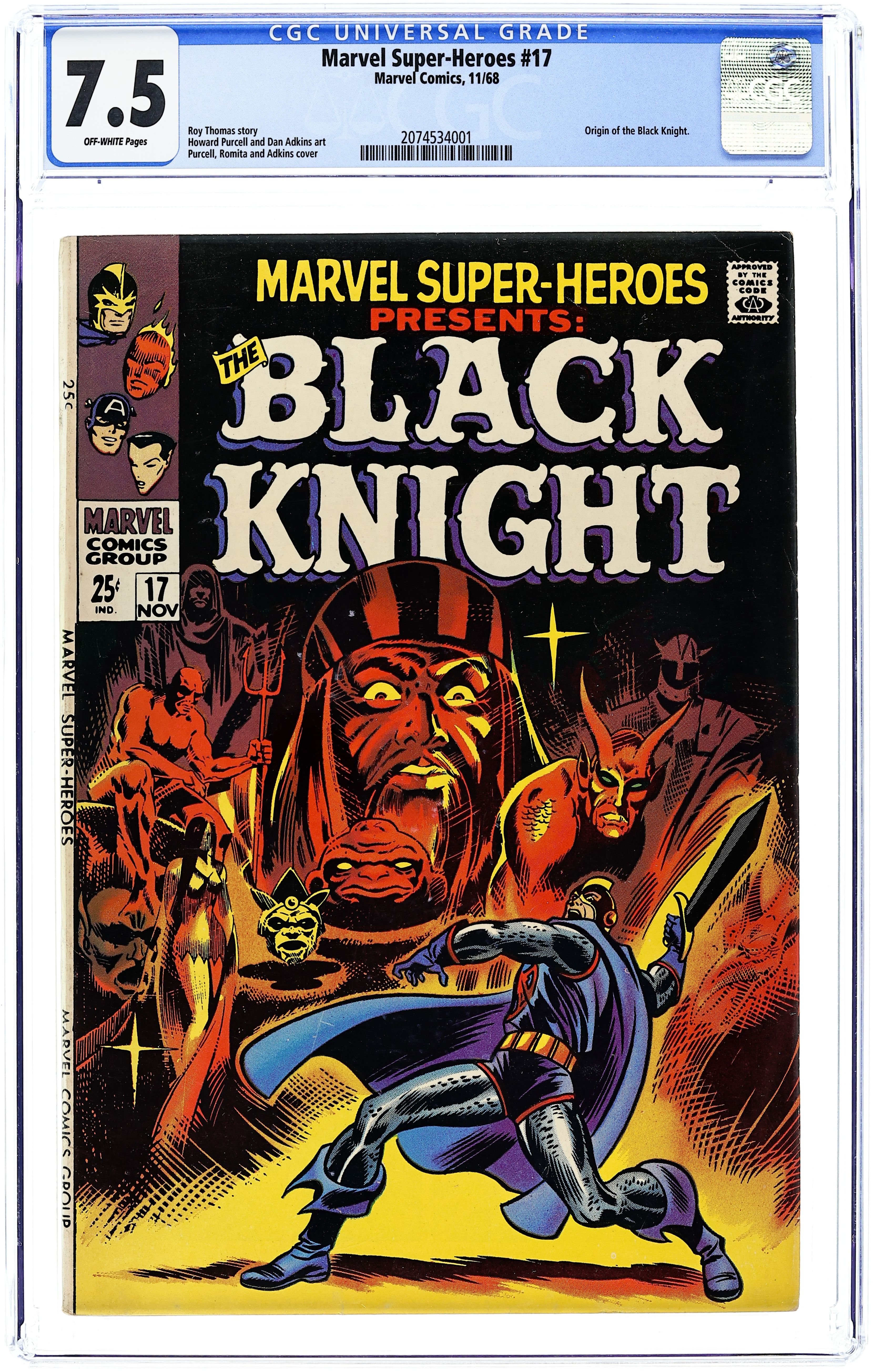 Giant-size issue. The origin of the Black Knight in "The Black Knight Reborn!" Script by Roy Thomas, pencils by Howard Purcell, inks by Dan Adkins and company. The remainder of the issue contains Golden Age reprints: the Human Torch, the Sub-Mariner, the All-Winners Squad featuring Captain America and Bucky ("Menace From the Future World!" from All-Winners 21). John Buscema/John Romita Sr. cover? Cover price $0.25. Grade: CGC 7.5 explanation of grade Condition: Used (collectible)