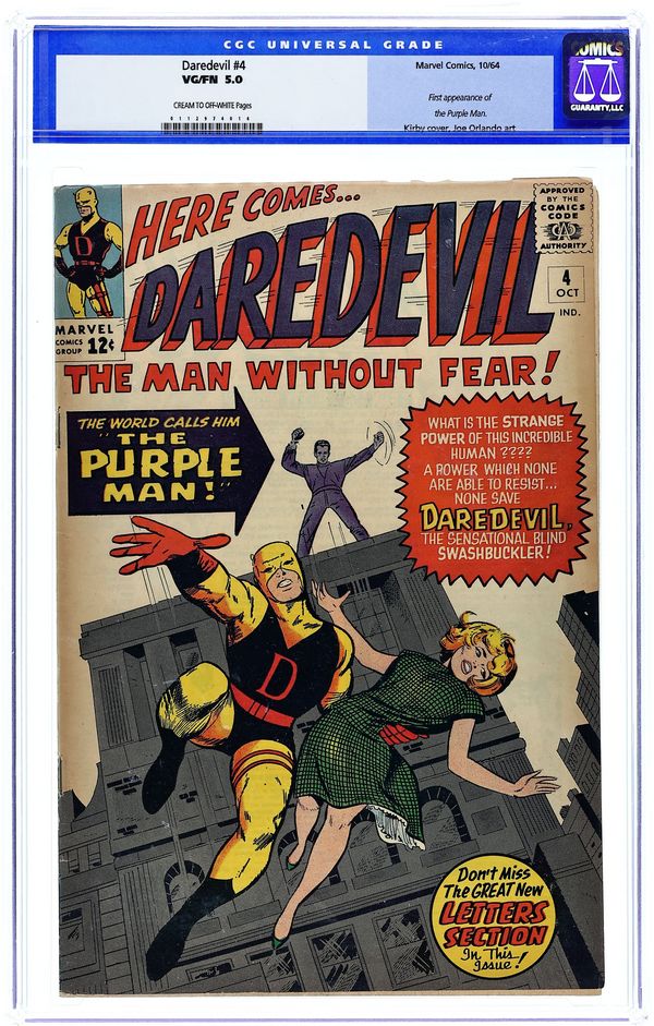 Cover pencils by Jack Kirby, inks by Vince Colletta. First appearance of the Purple Man in Killgrave, the Unbelievable Purple Man!, script by Stan Lee, pencils by Joe Orlando, inks by Vince Colletta; DD runs up against a purple man who can make anyone do what he wants just by suggesting it. First letters page. 36 pgs. Cover price $0.12. Cover price $0.12. Grade: CGC 5.0 explanation of grade Condition: Used (collectible)
