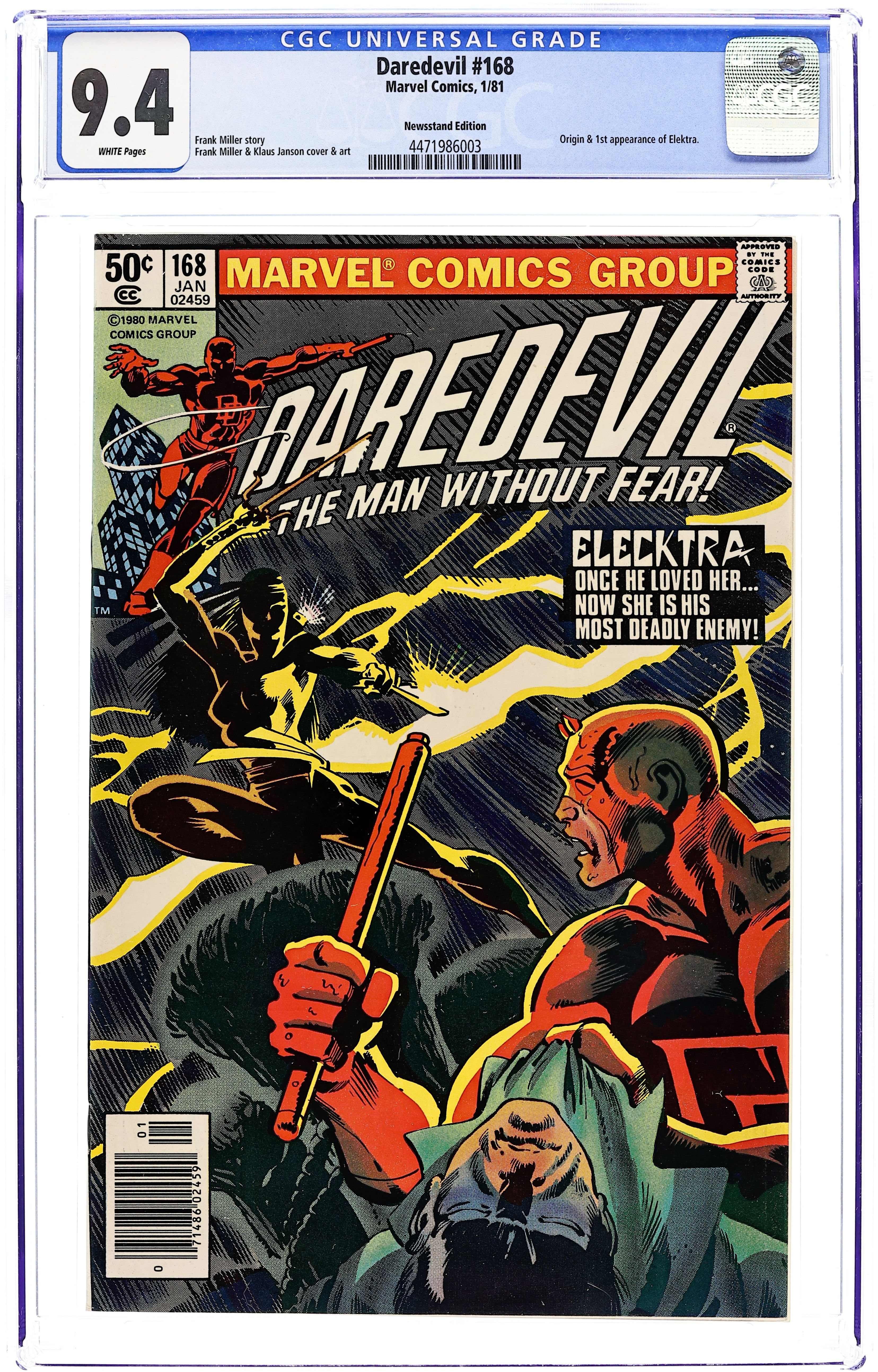 Starts Feb 23 Newsstand Edition. Cover pencils by Frank Miller, inks by Klaus Janson. First appearance of Elektra in Elektra, script by Frank Miller, pencils by Frank Miller (breakdowns) and Klaus Janson (finished art), inks by Klaus Janson; Matt is after an international criminal being protected by Eric Slaughter when he runs across his college sweetheart turned bounty hunter; this story, by the way, is a reworking of a couple of classic Spirit stories by Will Eisner, Sand Serif and Bring in Sand Serif (1950). 36 pgs. Cover price $0.50. Cover price $0.50. Grade: CGC 9.4 explanation of grade Condition: Used (collectible)